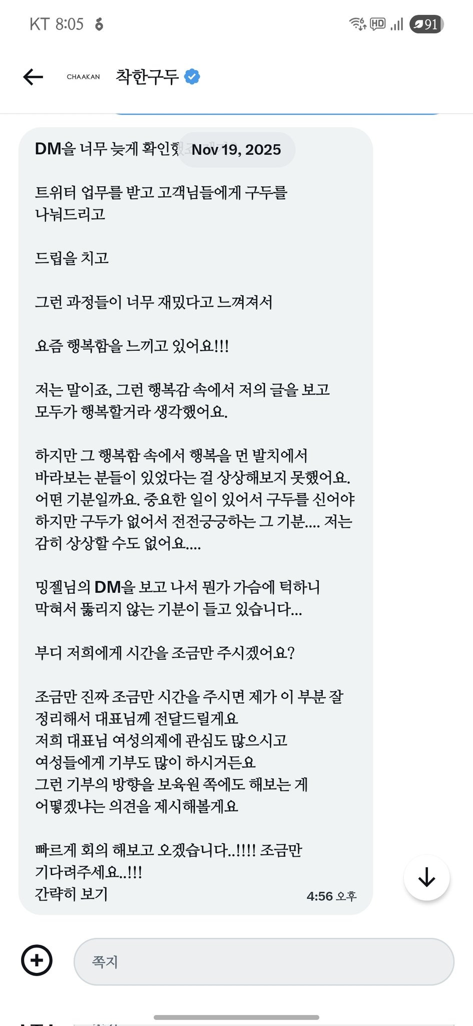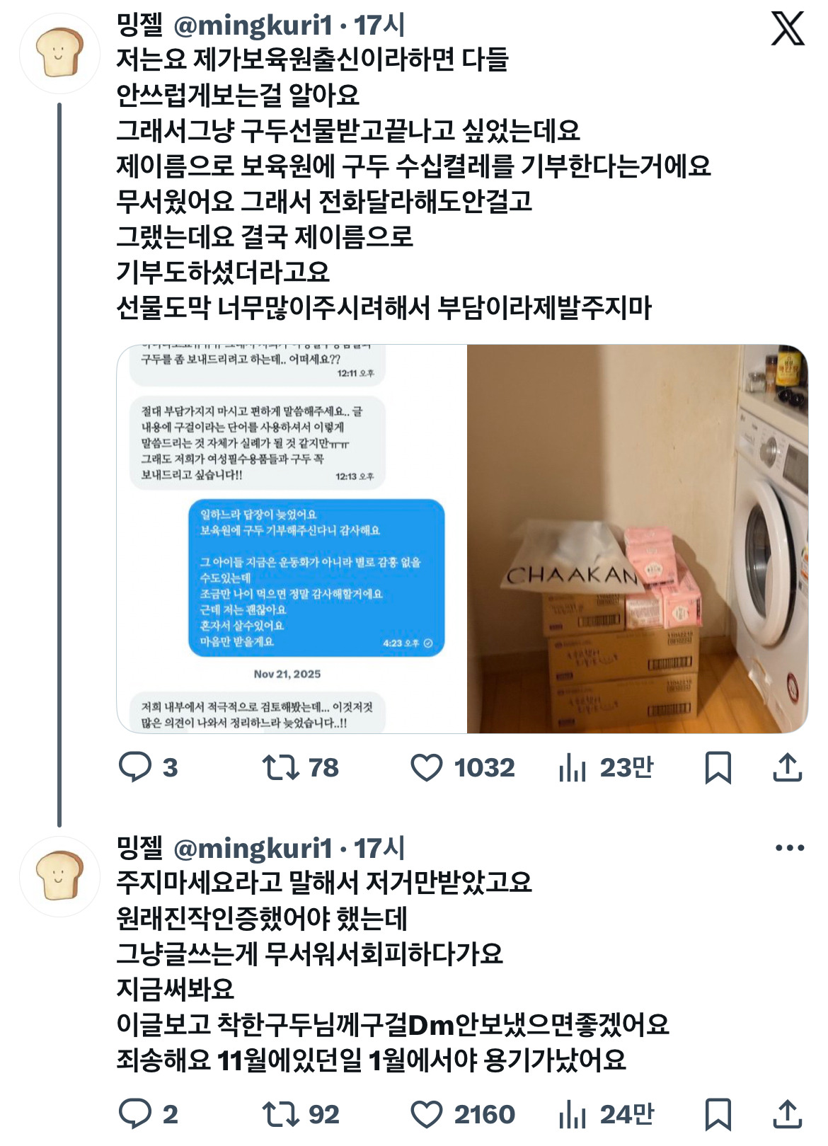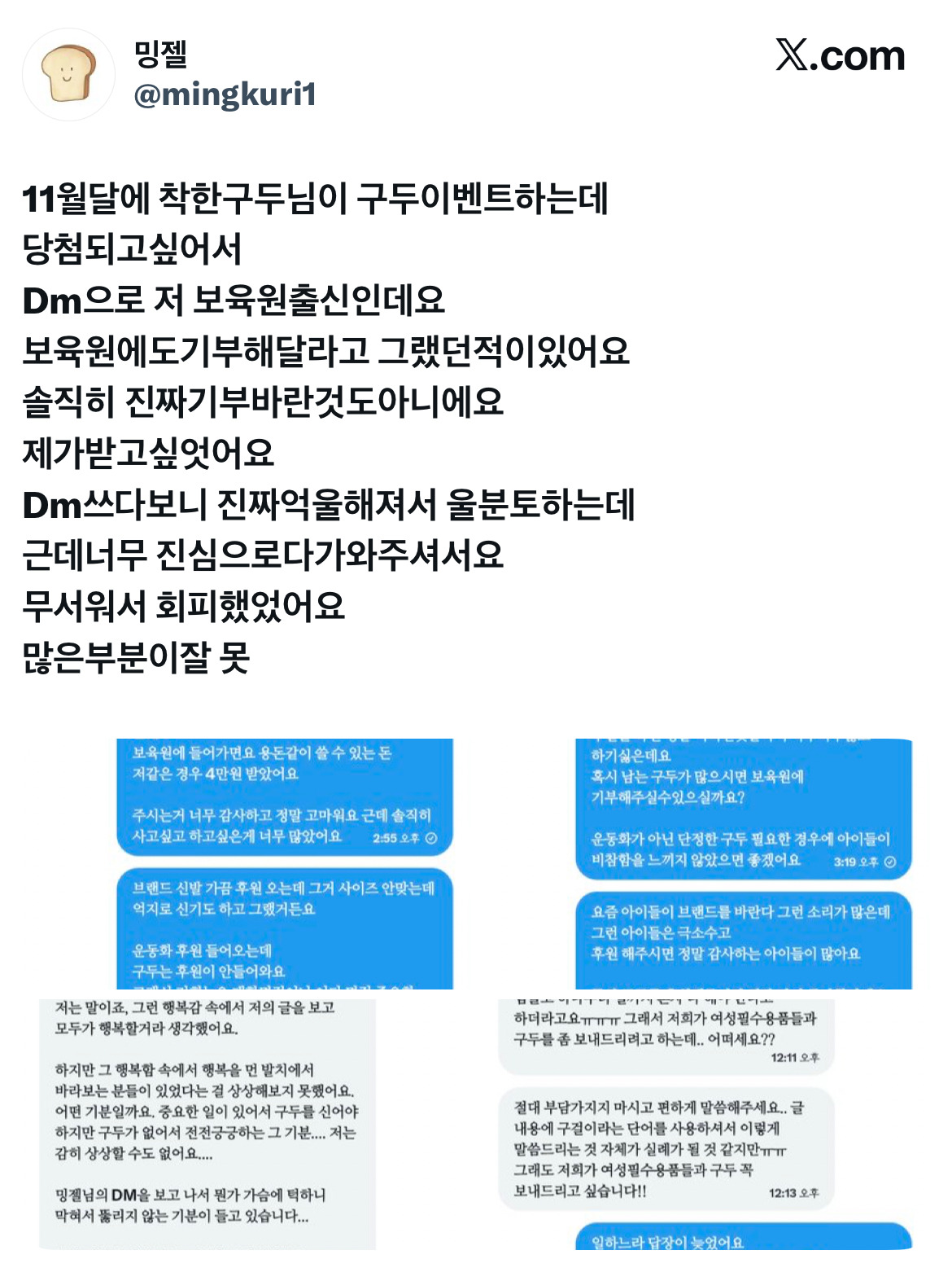 [흥미돋]구두이벤트하는데 당첨되고싶어서 Dm으로 저 보육원출신인데요 작성자조직|작성시간26.01.05|조회수78,875 목록 댓글 365 글자크기 작게가 글자크기 크게가 출처: 여성시대 조직https://x.com/mingkuri1/status/2007778377726640622?s=46&t=kmZDv0p3NhLOPn7h9yQqkQ 다음검색 현재 게시글 추가 기능 열기 북마크 공유하기 신고 센터로 신고 댓글 댓글 365 댓글쓰기 답글쓰기 댓글 리스트 작성자미룰께요 | 작성시간 26.01.12 중국산이 천원 더 싸도 이제 개착한구두로 살게요 작성자네임펜으로찍 | 작성시간 26.01.14 개착한 구두가 나를 울리네ㅜㅜㅜ 작성자백곰박하사 | 작성시간 26.01.16 맘아프다 마음이쁘고 나도 보육원에 구두선물주고싶다 그런심정까지생기네 작성자고기사랑 | 작성시간 26.01.17 크 진짜ㅜㅜ 작성자딛토 | 작성시간 26.01.18 아 디엠보낸 사람도 너무 착하고.. 저 기업은 미쳤다 댓글 전체보기