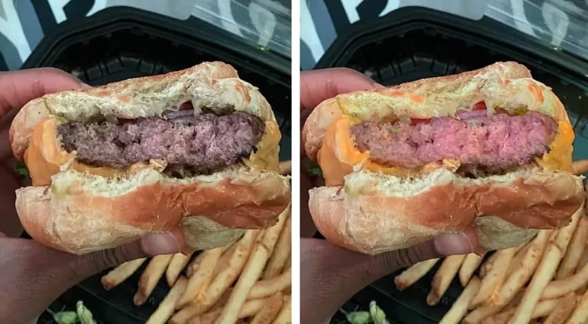 AI를 활용해 햄버거 패티가 덜 익은 것처럼 보이게 만든 모습. /더타임스