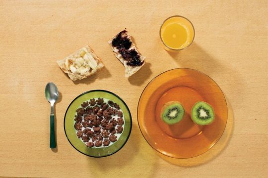 키위, 타르틴, 잼과 버터 바른 바게트, 우유, 시리얼, 오렌지주스