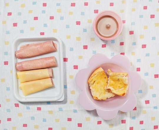 초콜렛우유, 라떼커피, 빵, 버터, 햄, 치즈