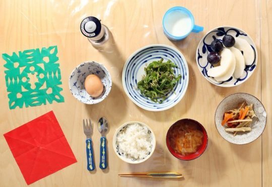 낫또, 쌀밥, 된장국, 으깬호박, 오이장아찌, 계란말이, 연어구이