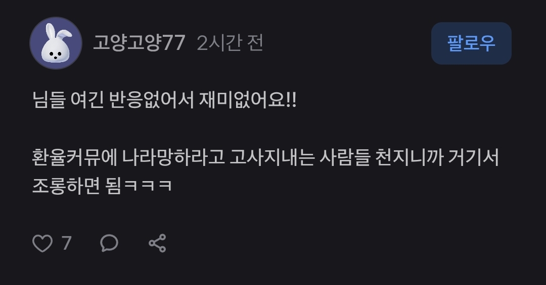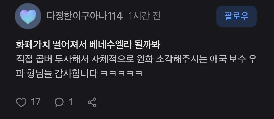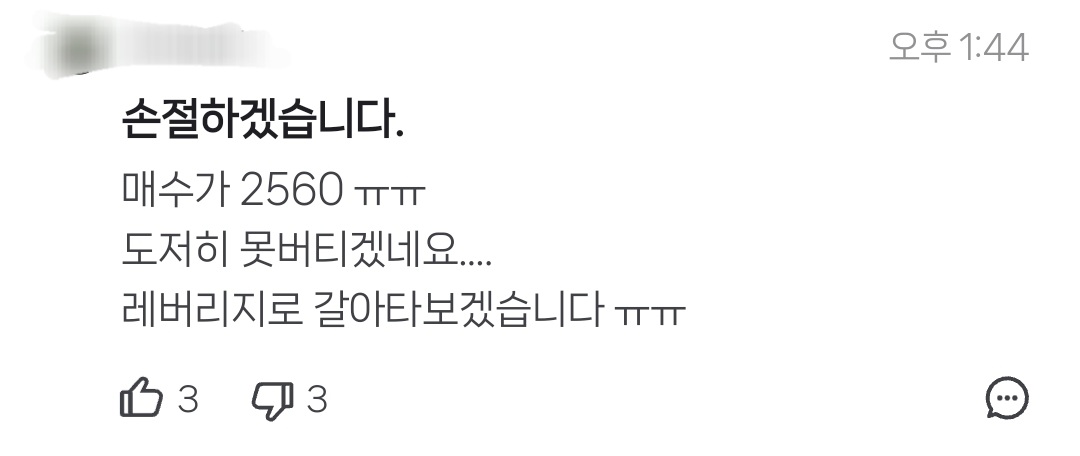 [흥미돋]오늘자 총 3억 5천만원 잃고 손 턴 곱버스 투자자.twt 작성자스피또띠아|작성시간26.01.05|조회수39,374 목록 댓글 171 글자크기 작게가 글자크기 크게가 출처: https://x.com/i/status/2008062526907719887 여성시대 스피또띠아3개월 전 기사인데이때 곱버스 탄 사람들 어케됐을지 궁금함 다음검색 현재 게시글 추가 기능 열기 북마크 공유하기 신고 센터로 신고 댓글 댓글 171 댓글쓰기 답글쓰기 댓글 리스트 작성자복숭아도련님 | 작성시간 26.01.06 푸핳 작성자나랑함께놀친구빙봉빙봉 | 작성시간 26.01.06 ㅋㅋㅋㅋㅋㅋㅋㅋㅋ 작성자마라엽떡우삼겹우동추가 | 작성시간 26.01.06 ㅋㅋㅋㅋㅋ 무임승차하는 윤어게인보다 이게 낫다 작성자일출보러갈래 | 작성시간 26.01.06 작성자김초삼 | 작성시간 26.01.06 고맙다 댓글 전체보기