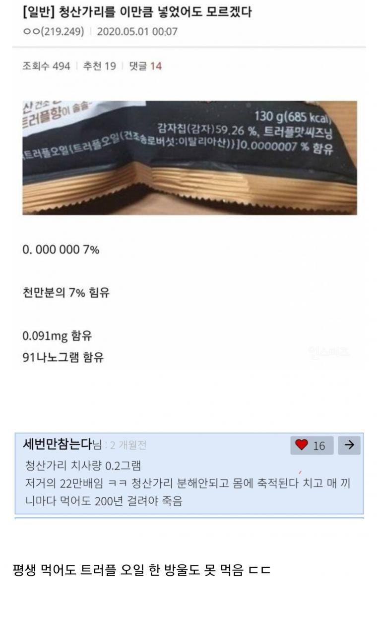 [스크랩] [흥미돋]청산가리를 이만큼 넣었어도 모르겠다.jpg 작성자두버이쫀둑쿠키|작성시간26.01.05|조회수51,641 목록 댓글 15 글자크기 작게가 글자크기 크게가 어케 만들었? 다음검색 스크랩 원문 : 도탁스 (DOTAX) 현재 게시글 추가 기능 열기 북마크 공유하기 신고 센터로 신고 댓글 댓글 15 댓글쓰기 답글쓰기 댓글 리스트 작성자로즈토네르 | 작성시간 26.01.05 만들때 트러플오일 냄새만 맡게해준듯 작성자Blue Hour | 작성시간 26.01.05 트러플 씻군물에 감자 씻었나.. 작성자올해꼭로또1등당첨될겁니다 | 작성시간 26.01.05 감자 키울때 트러플오일 그림 걸어두고 농사지었나보다 작성자버터카야토스트 | 작성시간 26.01.05 트러플 주파수 들으면서 만든 감자칩 답댓글 작성자Moon Sujin | 작성시간 26.01.05 주파숰ㅋㅋㅋㅋㅋ 댓글 전체보기