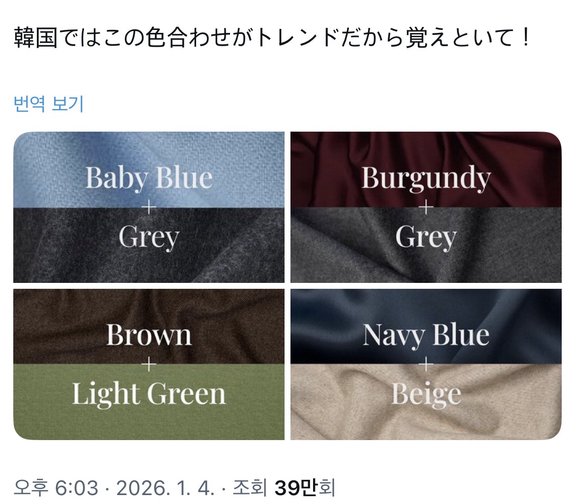 [흥미돋]일본트윗인데 한국에서 유행하는 색조합이라는데 작성자세 레나|작성시간26.01.05|조회수59,772 목록 댓글 45 글자크기 작게가 글자크기 크게가 출처:https://theqoo.net/talk/4051394471공감? 노공감? 다음검색 현재 게시글 추가 기능 열기 북마크 공유하기 신고 센터로 신고 댓글 댓글 45 댓글쓰기 답글쓰기 댓글 리스트 작성자오렌지라임나의 | 작성시간 26.01.06 버건디 꺼지규 오히랴 원색 레드 가디건 유행중 답댓글 작성자오렌지라임나의 | 작성시간 26.01.06 그리고 네이비랑 베이지 꺼지고 아이보리랑 베이지 조합이 더 유행인둣 작성자조울증 | 작성시간 26.01.06 요즘 3에 꽂혀잇슨 작성자BlessYou | 작성시간 26.01.06 약간 옛날 색조합같은디 한 2015쯤의.. 작성자퍼플콜라 | 작성시간 26.01.06 베이비블루 그레이 이쁘가 댓글 전체보기