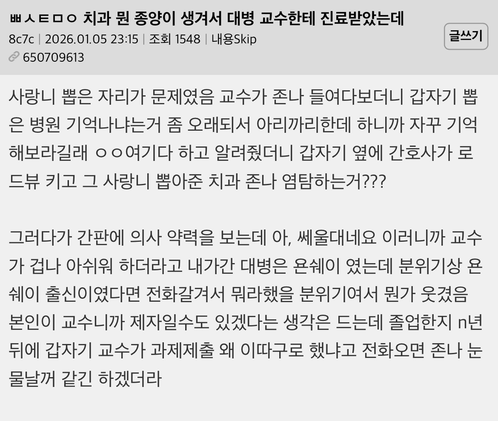 작성자크류뉴 작성시간 26.01.06 치과업계 좁아서 문제 생겼을때 다른치과갔더니 봐주지도 않고 돌려보낸거군..