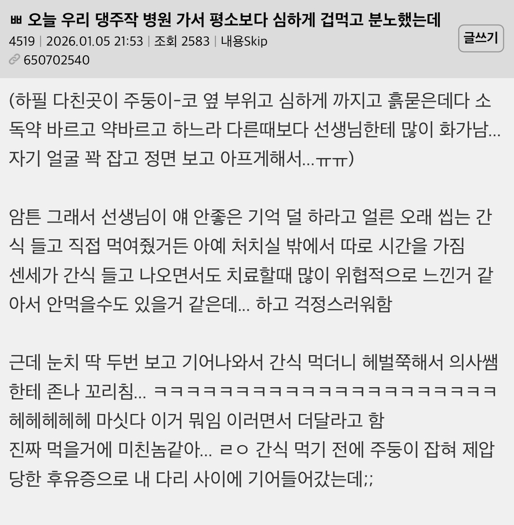 [흥미돋]오늘 우리 댕주작 병원 가서 평소보다 심하게 겁먹고 분노했는데 작성자MoMAA|작성시간26.01.05|조회수16,167 목록 댓글 7 글자크기 작게가 글자크기 크게가 출처: https://hygall.com/650702540 다음검색 현재 게시글 추가 기능 열기 북마크 공유하기 신고 센터로 신고 댓글 댓글 7 댓글쓰기 답글쓰기 댓글 리스트 작성자고양이성공단 | 작성시간 26.01.05 긍정 멍개ㅋㅋㅋ 또 하나 배웟다 작성자프라이드그린토마토 | 작성시간 26.01.05 강아지는 천사야ㅜㅜ 작성자천국행 | 작성시간 26.01.06 옐로우카드아직남았나보네 ㅋㅋ 작성자모에모에~모에p | 작성시간 26.01.06 저렇게 살아야되는디 ㅋㅋㅋ 작성자올림픽 공언 | 작성시간 26.01.06 고양이는.... 약에 츄르 섞어먹엿다고 화나서 지금 평생을 츄르를 안드셔 댓글 전체보기