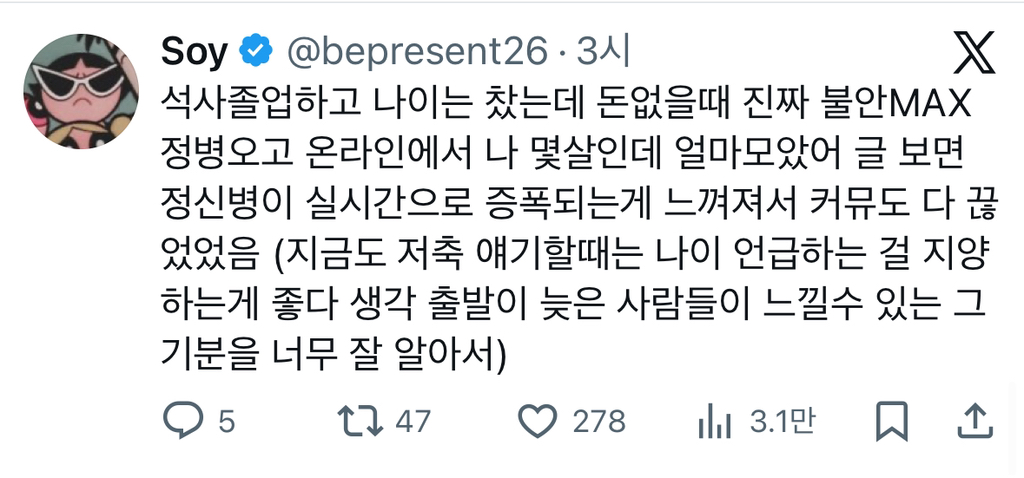 작성자점점더멀어지나봐 작성시간 26.01.06 그냥 아직 어리다는게 티 나는것같음 솔직히 여시에 아무리 나이 많이 봤자 40대일거아님…인생 나이 오십에서 번 돈 사기로 다 날릴 수도 있는데 지금 얼마건 그게 뭐가 중요함 사는 방식이 중요하지 숫자가 중요한게아니잖음