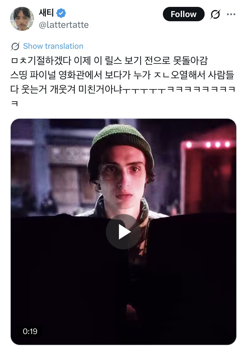 [흥미돋]영화관에서 기묘한이야기 막화보다 누가 오열해서 다들 빵터짐.twt 작성자공복유지|작성시간26.01.06|조회수12,688 목록 댓글 9 글자크기 작게가 글자크기 크게가 출처: https://x.com/lattertatte/status/2006889487809610227?s=20 다음검색 현재 게시글 추가 기능 열기 북마크 공유하기 신고 센터로 신고 댓글 댓글 9 댓글쓰기 답글쓰기 댓글 리스트 답댓글 작성자스띵시즌5 | 작성시간 26.01.06 나는 시끄러워수 집중 못할까봐 안갓는데 그러진 않앗어?! 작성자제일좋은어느날의데자뷰 | 작성시간 26.01.06 웃는 사람들도 눈물 흘리고 있었던거 다 알아!!!! 작성자레알 이재명스명스한 상황 | 작성시간 26.01.06 어 떠 케 안 울 어. . . 작성자aaioee | 작성시간 26.01.11 우리나라도 영화관에서 상영해줘... 작성자우랑 | 작성시간 26.01.18 ㅋㅋㅋㅋㅋㅋㅋ아 나도 울고싶러ㅜㅜㅜ 댓글 전체보기