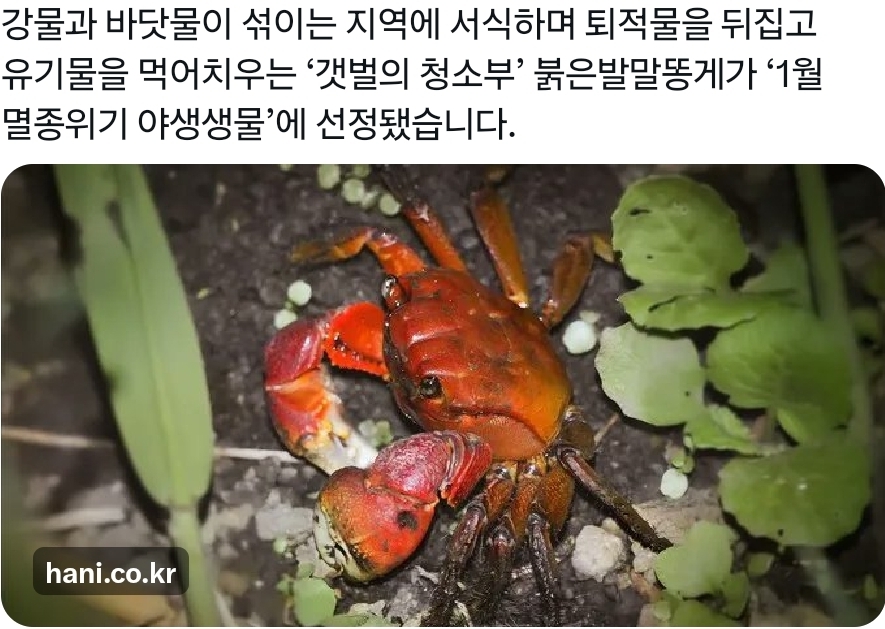 [여시뉴스데스크]“붉은 말의 해, 멸종 위기 ‘붉은발말똥게’도 기억해 주세요” 작성자todjdh|작성시간26.01.06|조회수10,839 목록 댓글 8 글자크기 작게가 글자크기 크게가 출처: https://www.hani.co.kr/arti/animalpeople/wild_animal/1238048.html“붉은 말의 해, 멸종 위기 ‘붉은발말똥게’도 기억해 주세요”강물과 바닷물이 섞이는 지역에 서식하며 퇴적물을 뒤집고 유기물을 먹어치우는 ‘갯벌의 청소부’ 붉은발말똥게가 ‘1월 멸종위기 야생생물’에 선정됐다. 다른 말똥게와 달리 집게다리가 선www.hani.co.kr 다음검색 현재 게시글 추가 기능 열기 북마크 공유하기 신고 센터로 신고 댓글 댓글 8 댓글쓰기 답글쓰기 댓글 리스트 작성자뿌두렁구 | 작성시간 26.01.06 붉은발말똥게! 작성자두바이안쫀득쿠키 | 작성시간 26.01.06 따봉똥게야 화이팅 작성자우울해하지말자? | 작성시간 26.01.06 붉은발말똥게!! 작성자왠 아니고 ㅣ웬ㅣ고슴도치 | 작성시간 26.01.06 멸종위기 탈출하자 붉은발말똥게야 힘내!! 작성자asap baby hurry up dont be lazy | 작성시간 26.01.06 따봉 붉응발말똥게야 파이팅 댓글 전체보기
