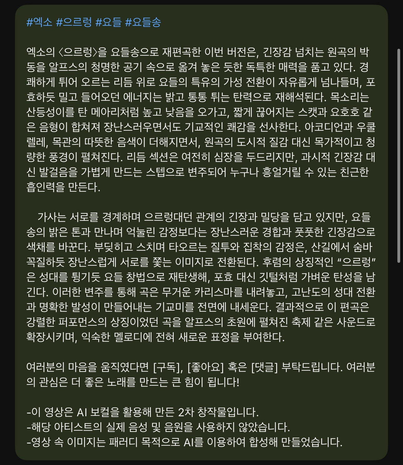 [흥미돋]트위터에서 보고 올리는 엑소 ai버전 요들송 작성자바나나스플릿구슬|작성시간26.01.06|조회수2,302 목록 댓글 7 글자크기 작게가 글자크기 크게가 출처: https://youtu.be/fVhH3_dDABM?si=K9huC1IYFfRSn843엑소 팬 아님 갑자기 내 탐라에 흘러들어와서 보고 웃기길래 올림 다음검색 현재 게시글 추가 기능 열기 북마크 공유하기 신고 센터로 신고 댓글 댓글 7 댓글쓰기 답글쓰기 댓글 리스트 작성자릴에이블 | 작성시간 26.01.06 ㅋㅋㅋㅋㅋㅋㅋㅋㅋㅋㅋㅋ좋은데;;:??;;;;;개웃겨 작성자약한뭐요 | 작성시간 26.01.06 요르렁 요르렁 요르렁 대 작성자다이어때 | 작성시간 26.01.06 으르렁에서 터짐 작성자쿨링밤 | 작성시간 26.01.06 미친거같닼ㅋㅋㅋㅋ 작성자초록우유 | 작성시간 26.01.07 시발이게뭐얔ㅋㅋㅋㅋㅋㅋㅋㅋㅋㅋㅋㅋㅋ 댓글 전체보기