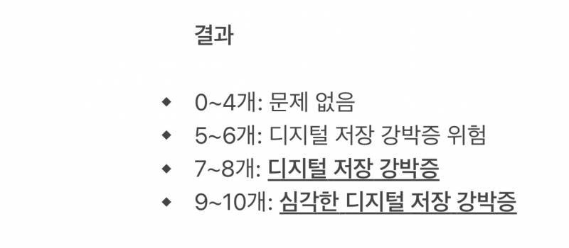 [스크랩] [흥미돋]디지털 저장 강박증 테스트 작성자모네|작성시간26.01.06|조회수25,017 목록 댓글 52 글자크기 작게가 글자크기 크게가 다음검색 스크랩 원문 : 쭉빵카페 현재 게시글 추가 기능 열기 북마크 공유하기 신고 센터로 신고 댓글 댓글 52 댓글쓰기 답글쓰기 댓글 리스트 작성자담배피우는 호랑이 | 작성시간 26.01.06 9개.. 작성자나무십자가 | 작성시간 26.01.06 9개 ㅠㅠ 작성자재명핑화이팅 | 작성시간 26.01.07 나완전저랫는디 그냥 맘을 비웟음… 쓸만한건 인스스에 다올리고 걍 다지움 ㅠㅠㅠㅠ 작성자곰브리치야 내 이름 적어둬라 | 작성시간 26.01.07 심각하네… 작성자려차 | 작성시간 26.01.07 7 댓글 전체보기
