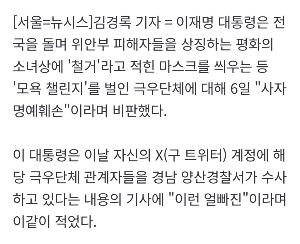 [여시뉴스데스크]이 대통령, '극우단체 소녀상 모욕'에 "사자명예훼손" 작성자마루와강쥐|작성시간26.01.06|조회수955 목록 댓글 7 글자크기 작게가 글자크기 크게가 출처: https://naver.me/F16tw29m이 대통령, '극우단체 소녀상 모욕'에 "사자명예훼손"이재명 대통령은 전국을 돌며 위안부 피해자들을 상징하는 평화의 소녀상에 '철거'라고 적힌 마스크를 씌우는 등 '모욕 챌린지'를 벌인 극우단체에 대해 6일 "사자명예훼손"이라며 비판했다. 이 n.news.naver.com 다음검색 현재 게시글 추가 기능 열기 북마크 공유하기 신고 센터로 신고 댓글 댓글 7 댓글쓰기 답글쓰기 댓글 리스트 작성자둠칫드드둠 | 작성시간 26.01.06 지구에 자원도 한정적인데 살려놓는게 맞나 싶어~ 작성자LEE재명 | 작성시간 26.01.06 사형시켜주세요 개한남동현이들 뒤져버려라 작성자동결건조딩초 | 작성시간 26.01.06 산소 아까워 작성자참참치 | 작성시간 26.01.06 진짜 딴거모르겠고 일베 친일파 싫어하는거 원툴만이라도 속시원 작성자우리 아이가 잘나졌어요 | 작성시간 26.01.06 내통령 댓글 전체보기
