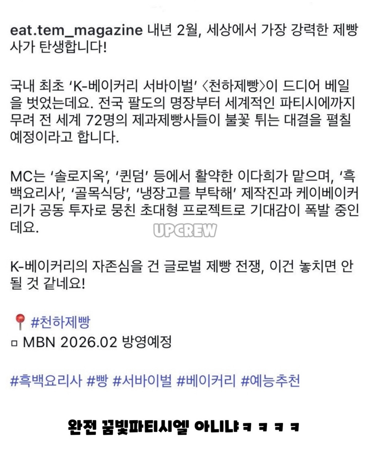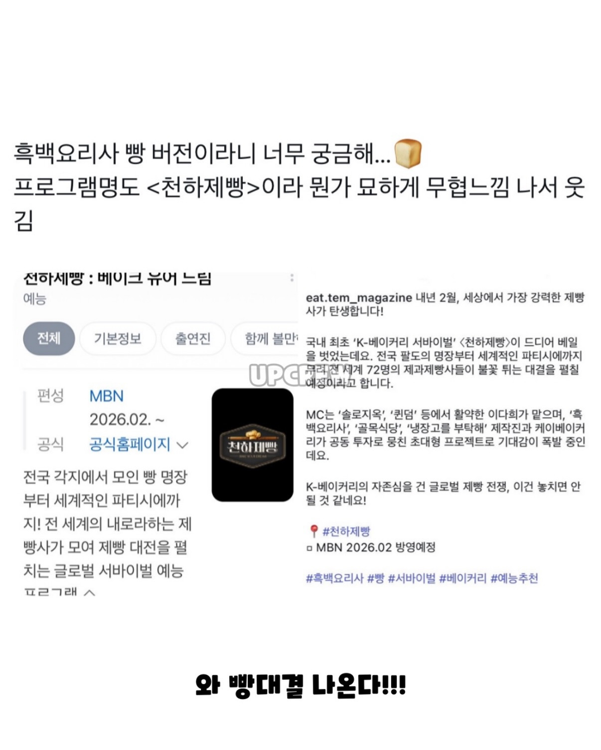 작성자명란바질크림파스타 작성시간 26.01.07 아오이토리 사장님 나오실라나 흑백1도 나가셨었는디 성심당 출신 제빵사도 많이 나오려나???