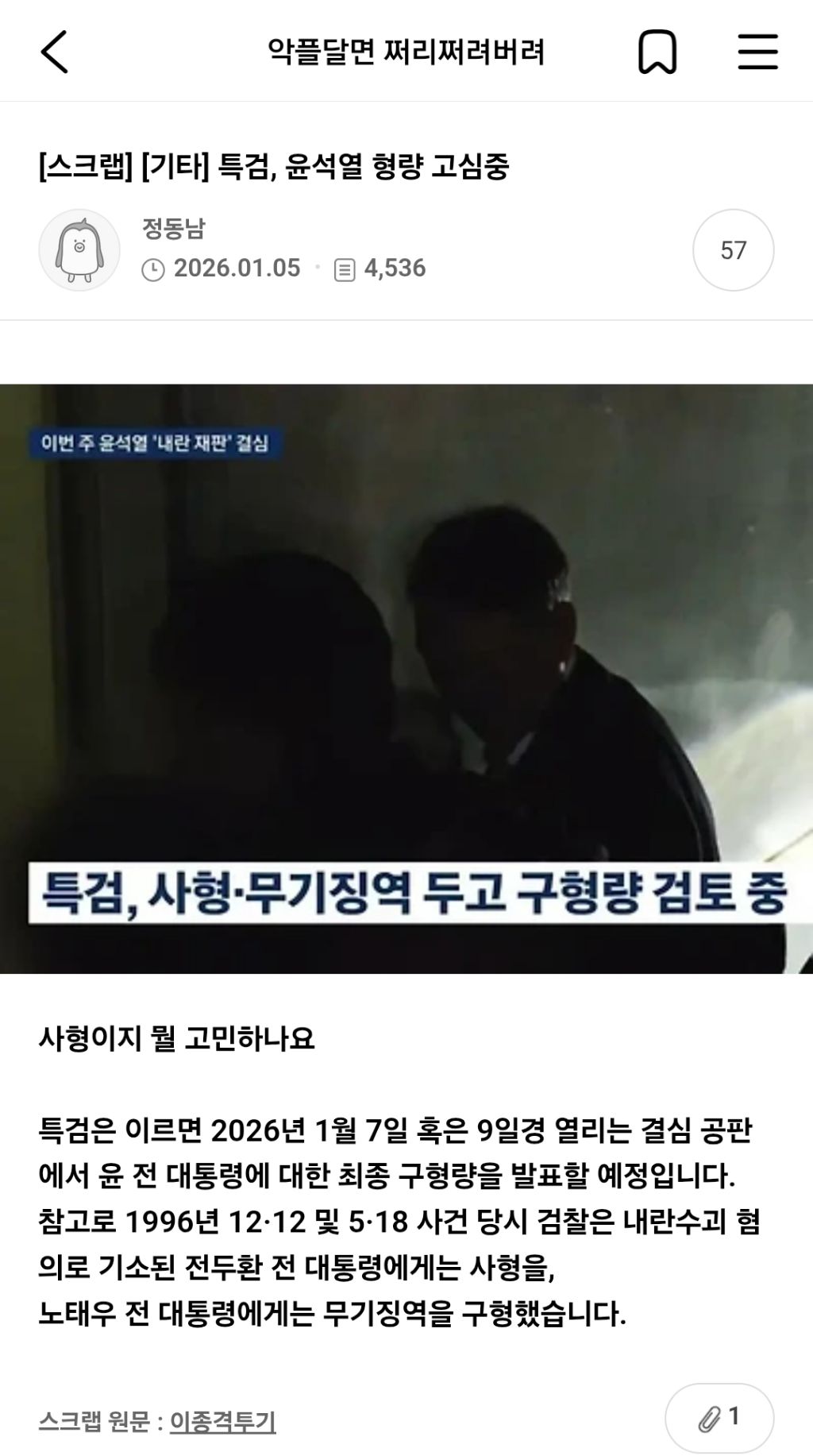 [기타]특검, 윤석열 무기징역 or 사형 두고 구형량 검토중 작성자정동남|작성시간26.01.06|조회수5,158 목록 댓글 164 글자크기 작게가 글자크기 크게가 출처:https://m.cafe.daum.net/subdued20club/ReHf/5542217?svc=cafeapp특검, 윤석열 형량 고심중사형이지 뭘 고민하나요 특검은 이르면 2026년 1월 7일 혹은 9일경 열리는 결심 공판에서 윤 전 대통령에 대한 최종 구형량을 발표할 예정입니다.참고로 1996년m.cafe.daum.net 다음검색 현재 게시글 추가 기능 열기 북마크 공유하기 신고 센터로 신고 댓글 댓글 164 댓글쓰기 답글쓰기 댓글 리스트 작성자옥스스 | 작성시간 26.01.06 사형 작성자하리보콜라 | 작성시간 26.01.06 사형 ㄱ 작성자웃으며 안녕 | 작성시간 26.01.06 사형에 부관참시까지 작성자태방 | 작성시간 26.01.06 사형ㄱ 작성자일본의 빠른 대지진을 기원합니다! | 작성시간 26.01.07 항소감형 생각하면 사형이 맞음 댓글 전체보기