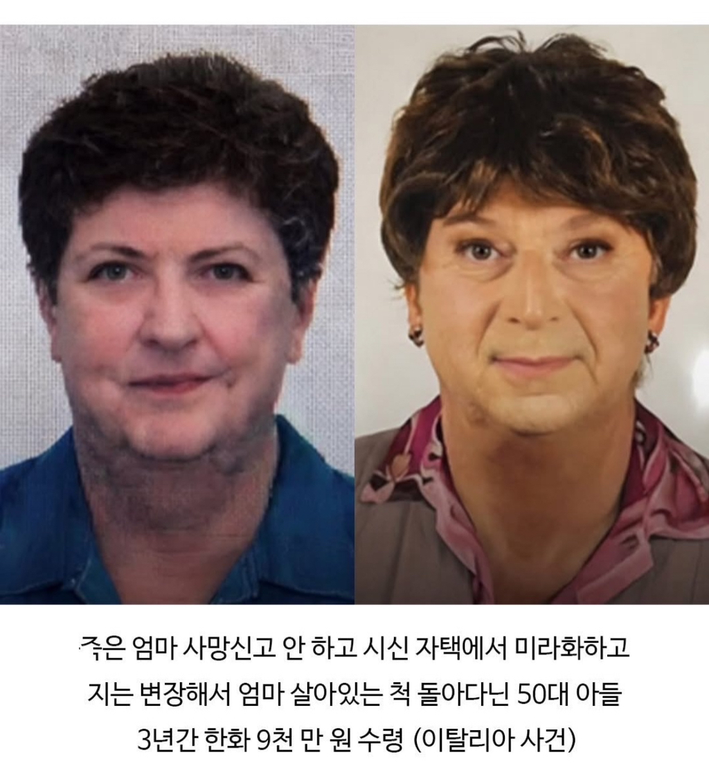 [흥미돋]연금받기 위해 엄마인척 여장한 아들 작성자니나니노니고질라야|작성시간26.01.06|조회수7,537 목록 댓글 10 글자크기 작게가 글자크기 크게가 출처: 여성시대 (본인 닉네임) 다음검색 현재 게시글 추가 기능 열기 북마크 공유하기 신고 센터로 신고 댓글 댓글 10 댓글쓰기 답글쓰기 댓글 리스트 작성자뇽뇽죽겠지 | 작성시간 26.01.06 미칭럼 작성자칵테일 사랑 | 작성시간 26.01.06 사형시켜야 돼 또라이새끼 작성자꽃분 | 작성시간 26.01.06 아들들은 대체...ㅋ 와..자택에서 시신을 미라화...ㅋ 작성자움직여손들면쏜다 | 작성시간 26.01.06 에휴 작성자사기적부정거래=주식사기 | 작성시간 26.01.07 ㅁㅊ 댓글 전체보기