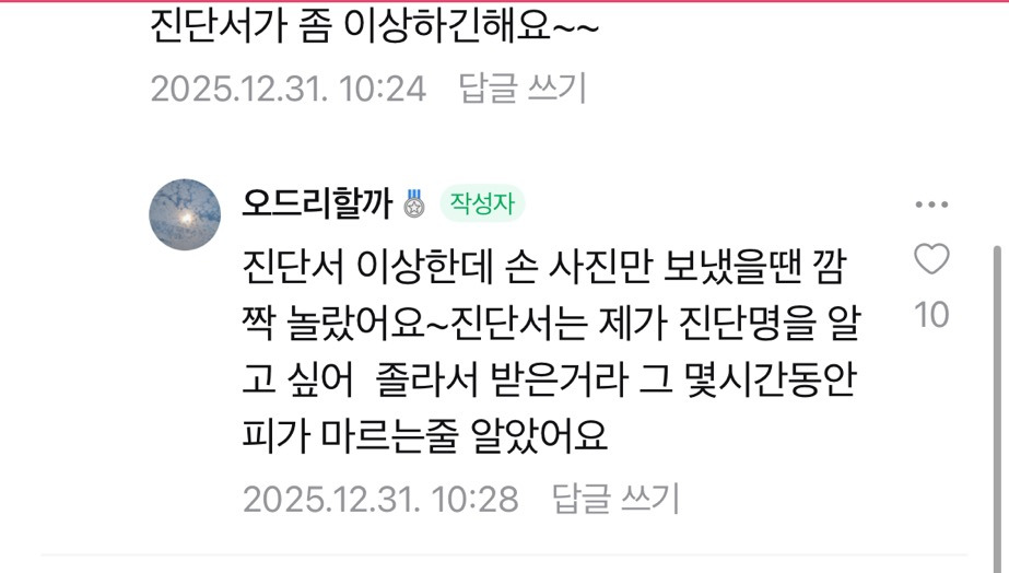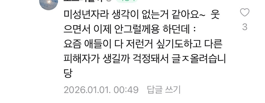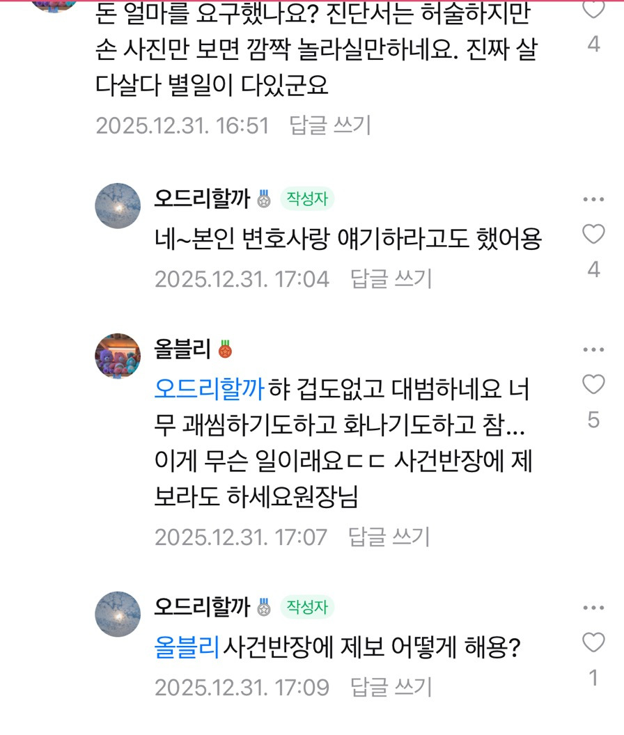 [흥미돋]ai로 사진 조작해서 돈 뜯어내려고 한 미성년자.jpg 작성자(본인 닉네임),|작성시간26.01.06|조회수33,960 목록 댓글 36 글자크기 작게가 글자크기 크게가 출처: 여성시대 (본인 닉네임), 처음엔 진단서 없이 손 사진만 보내서 속았나봐 다음검색 현재 게시글 추가 기능 열기 북마크 공유하기 신고 센터로 신고 댓글 댓글 36 댓글쓰기 답글쓰기 댓글 리스트 작성자ICDIWABH | 작성시간 26.01.06 미자여도 성인됐을때 처벌 받을 수 있게 해야함세상 우습게 보네 작성자맹리단깅 | 작성시간 26.01.06 와 작성자aliexpress | 작성시간 26.01.06 와 작성자왕대지 | 작성시간 26.01.06 문서 위조인데 저거 강력하게 처벌해야하는거아냐?사문서위조죄 형사처벌 대상인데 고소하셨으면 좋겠다사문서위조죄+위조사문서행사죄+사기미수인데 무슨 배짱으로 저런 짓을... 작성자2026년 성공하자 | 작성시간 26.01.06 무섭다 진짜 댓글 전체보기
