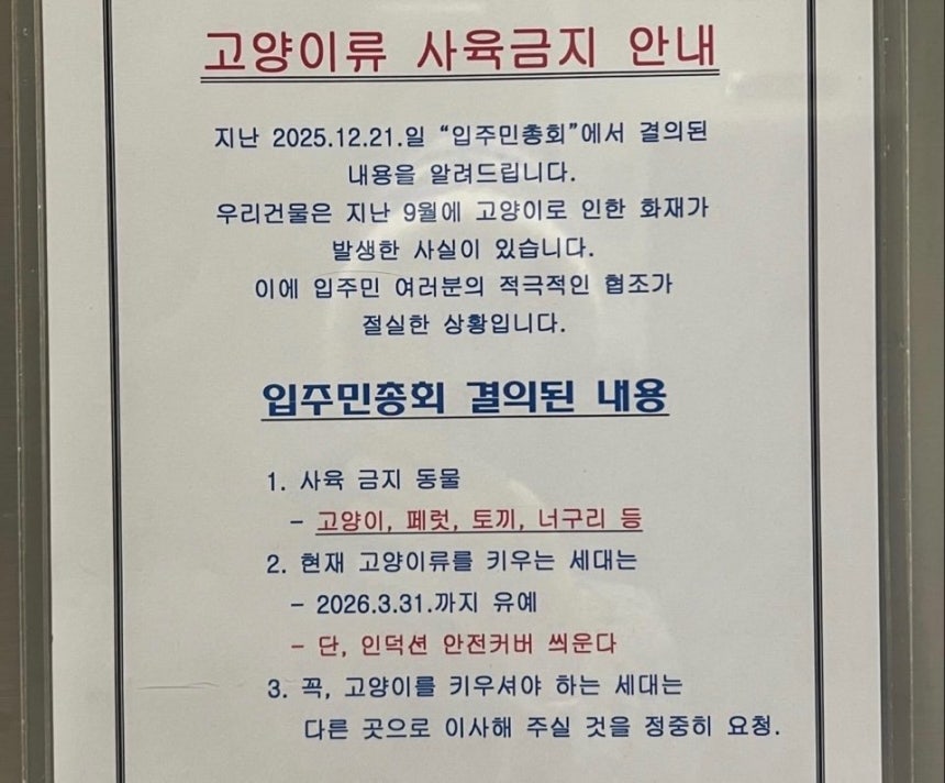 공지문 작성자인 관리사무소 측은 “2025년 12월 21일 입주민 총회에서 결의된 내용을 알려드린다”며 고양이를 키우는 세대의 이사를 요청했다.