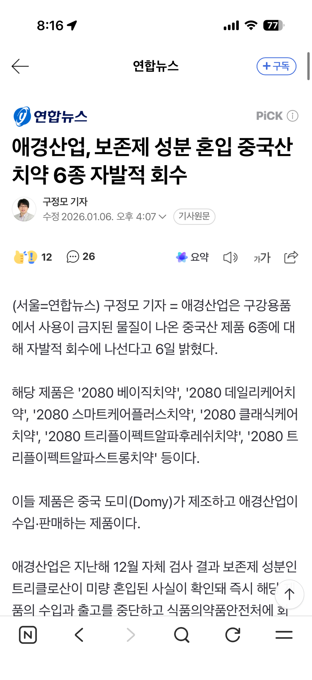 [여시뉴스데스크]애경산업, 보존제 성분 혼입 중국산 치약 6종 자발적 회수 작성자‘Prove it’|작성시간26.01.06|조회수11,105 목록 댓글 44 글자크기 작게가 글자크기 크게가 출처: https://naver.me/IxKBTEOP애경산업, 보존제 성분 혼입 중국산 치약 6종 자발적 회수애경산업은 구강용품에서 사용이 금지된 물질이 나온 중국산 제품 6종에 대해 자발적 회수에 나선다고 6일 밝혔다. 해당 제품은 '2080 베이직치약', '2080 데일리케어치약', '2080 스마트케어플러스n.news.naver.com아 ㅠㅠㅠ 샤갈 다음검색 현재 게시글 추가 기능 열기 북마크 공유하기 신고 센터로 신고 댓글 댓글 44 댓글쓰기 답글쓰기 댓글 리스트 작성자이글뜨 | 작성시간 26.01.07 쓰고잇는건 어카라는거 ㅡㅡ ㅅㅂ 작성자쌍바위골의 내적갈등 | 작성시간 26.01.07 뭔 사고 친 기업들 잠잠해진다 싶으면 또 기어나옴.. 심지어 개선도 하지 않음 작성자오원 | 작성시간 26.01.07 덴탈클리닉2080오리지날알파블루치약 이것도?? 이미지 확대 답댓글 작성자단숨에알아볼게 | 작성시간 26.01.07 이건 아닌듯?? 작성자육삼빌딩1 | 작성시간 26.01.07 짜증나네 겁나 많이 썼는데 댓글 전체보기