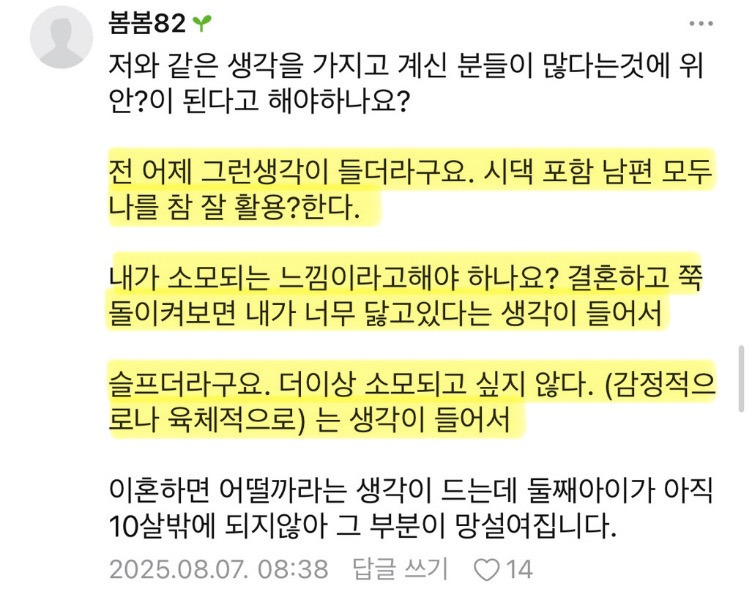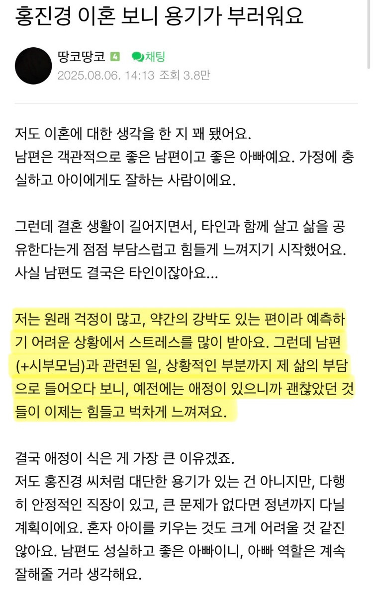 작성자웬손잡이 작성시간 26.01.06 진심 글만 봐도 개피곤하다 이혼하고 싶어도 저 생활에 익숙해져서 못하거나 해도 엄청 늦게 하게 됨..