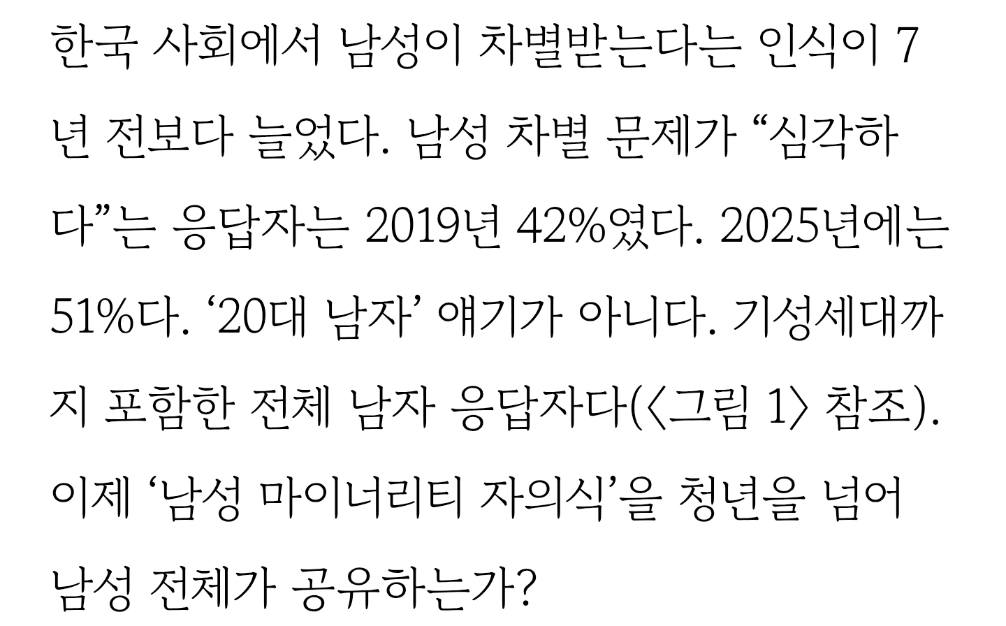 답댓글 작성자개저담금주 작성시간 26.01.07 남자들의 의견이 세대를 넘어 하나로 모인 것처럼 보이나(“남성 차별 심각하다”), 실은 대단히 이질적인 두 의견으로 나뉜다(‘구조적 남성 차별론’과 ‘남녀 상호 유불리론’)는 걸 보였다. ‘구조적 남성 차별론’이 ‘남성 차별 의식’을 대표하지 않는다는 것을 데이터로 확인했고, 그 소수의견이 어디서 나오는지 6개 스펙트럼 모델로 설명했다. 남자들의 주된 주장은 ‘남녀 상호 유불리론’이다. 이는 여성들에게도 공감대가 폭넓게 있다. 정책가나 전문 연구자들이 이것까지 부정하는 태도를 보인다면 남자들은 물론이고 여자들 대부분도 이해하기 어려워할 것이다.