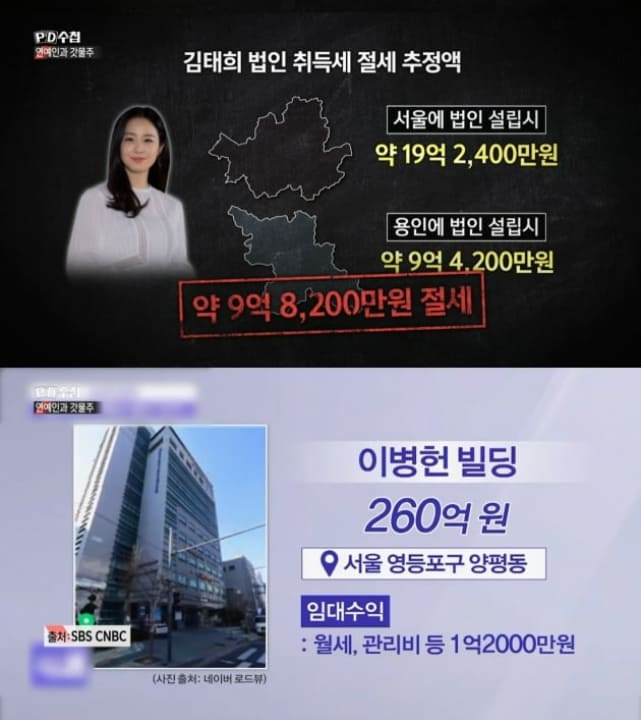 김태희의 탈세에 자연스레 김태희 재산과 더불어 김태희 법인이 소유하고 있는 부동산까지 관심이 쏠렸습니다. 김태희는 개인과 법인을 통해 초고가 아파트와 빌딩 등을 소유하고 있는 것으로 나타났습니다.