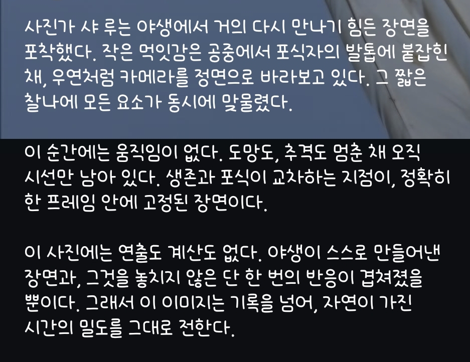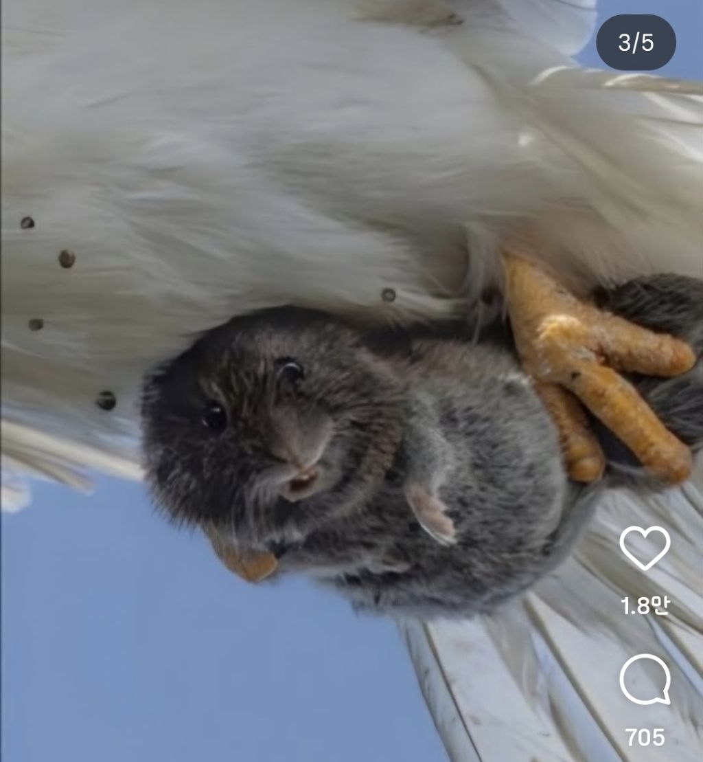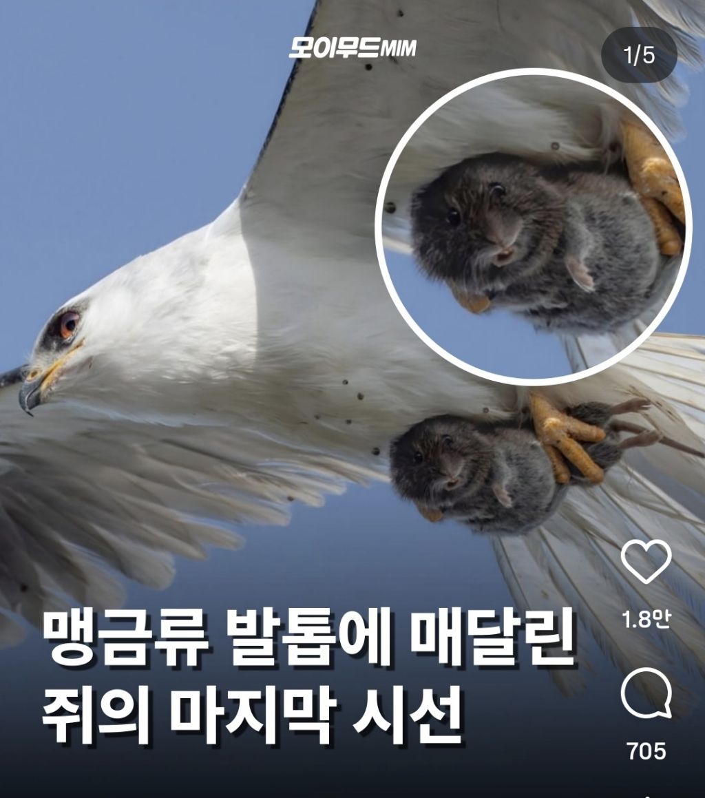 [기타]맹금류 발톱에 매달린 쥐의 마지막 시선 작성자다잘된당|작성시간26.01.07|조회수27,525 목록 댓글 32 글자크기 작게가 글자크기 크게가 출처: https://www.instagram.com/p/DTFhts2gd1Zㅠㅠ다음생엔 맹수로 태어나거라 다음검색 현재 게시글 추가 기능 열기 북마크 공유하기 신고 센터로 신고 댓글 댓글 32 댓글쓰기 답글쓰기 댓글 리스트 작성자롤모델=얼룩말 | 작성시간 26.01.07 쥐야 극락왕생 하렴 ㅜㅠㅜㅠㅠ 작성자피친토드 | 작성시간 26.01.07 나 이거 잘 못보겠더라.....넘슬픔....쥐야 좋은세상에서 다시태어나 작성자ESFP-T | 작성시간 26.01.07 으ㅏㄱ ㅠㅠㅠ 작성자가랏 식인친칠라 | 작성시간 26.01.07 마음아프다.. 지구는 지옥이 맞다 ㅜㅜ 작성자포카리해 | 작성시간 26.01.07 ㅠㅠㅠㅠㅠㅠ 댓글 전체보기