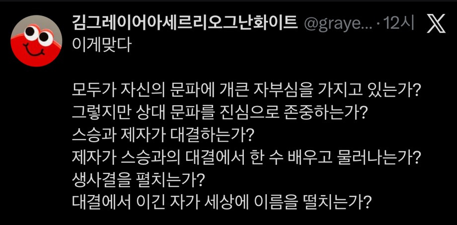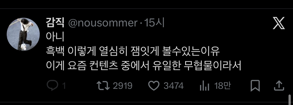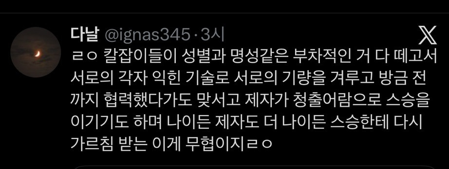 [흥미돋]흑백요리사를 이렇게 열심히 잼잇게 볼수있는이유 작성자요호호이요|작성시간26.01.07|조회수25,440 목록 댓글 30 글자크기 작게가 글자크기 크게가 출처: @nousomm알고보니 간만에 대중성있는 무협액션물전부 칼집에서 자기 칼 꺼내는것만봐도 다음검색 현재 게시글 추가 기능 열기 북마크 공유하기 신고 센터로 신고 댓글 댓글 30 댓글쓰기 답글쓰기 댓글 리스트 작성자식인친칠라행정기계 | 작성시간 26.01.07 나도 봐야겠다 생각해보니 진짜 무협물이네 ㅋㅋㅋㅋㅋㅋ 작성자그래나미쳤다 | 작성시간 26.01.07 칼가져오는게 너무 멋져 작성자행복 강쥐 | 작성시간 26.01.07 맞다 이거다 무협물이야 작성자ㅁㄴㅇ7ㅁㄴㅇ | 작성시간 26.01.07 후덕죽 아부지 올라갔으면 좋겠어 ㅠㅠㅠㅠ 그럼 누가 이겨도 편할거같아 작성자시간의간극 | 작성시간 26.01.08 아 ㄹㅇ무협ㅋㅋㅋㅋㅋㅋ 댓글 전체보기