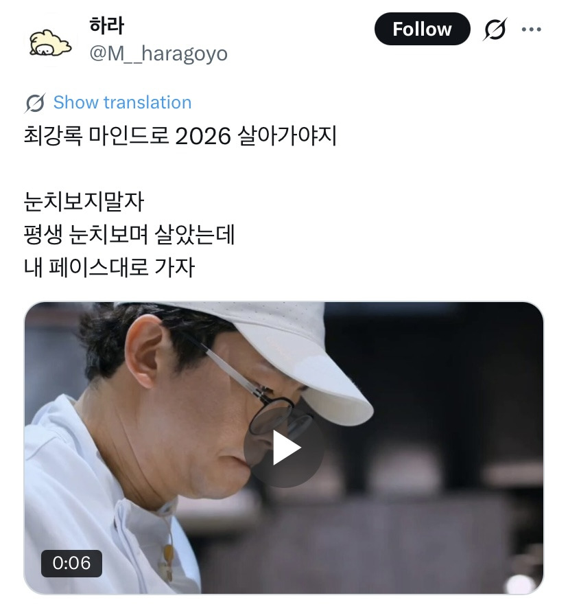 [흥미돋]최강록 마인드로 2026 살아가야지 작성자긍정기운|작성시간26.01.07|조회수61,365 목록 댓글 39 글자크기 작게가 글자크기 크게가 출처: https://x.com/M__haragoyo/status/2008461878461378653?s=20 다음검색 현재 게시글 추가 기능 열기 북마크 공유하기 신고 센터로 신고 댓글 댓글 39 댓글쓰기 답글쓰기 댓글 리스트 작성자wake up | 작성시간 26.01.07 최강록 말하는 게 넘재밌음 작성자하데스 | 작성시간 26.01.07 남의 눈치 보는거랑 내인생 내맘대로 지르는거랑은 다른 문제니까 작성자햇빛행운 | 작성시간 26.01.07 최강록 이번에 출연해서 말하는거 울림이 있음 작성자ㅁㄴㅇ7ㅁㄴㅇ | 작성시간 26.01.07 진짜 좋은말이야 ..mbti상관없이 .. 작성자xnxbwkq | 작성시간 26.01.07 내페이스로 댓글 전체보기