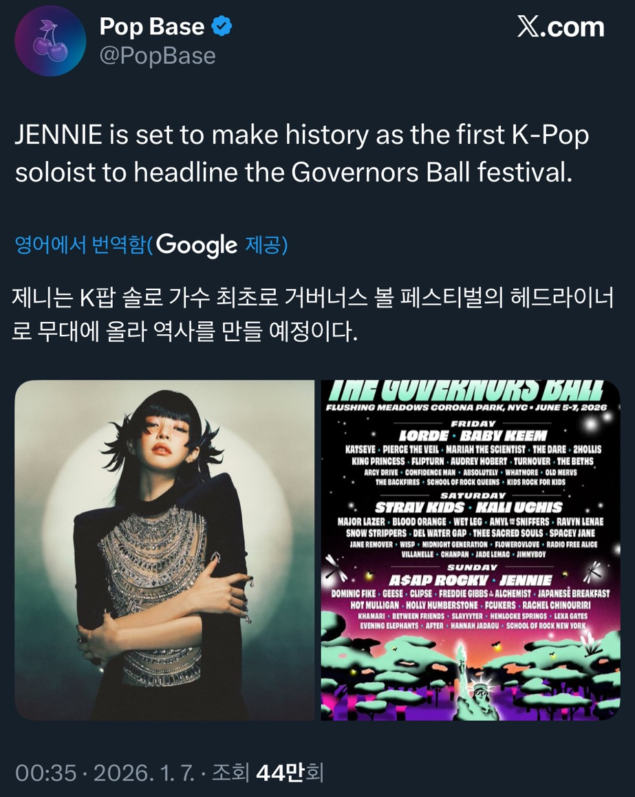 [흥미돋]미국, 유럽 대형 페스티벌에서 케이팝 여성솔로 최초로 헤드라이너 선다는 블랙핑크 제니 작성자Koolist|작성시간26.01.07|조회수12,102 목록 댓글 25 글자크기 작게가 글자크기 크게가 출처: 여성시대 koolist유럽의 코첼라라 불린다는 매드쿨 페스티벌둘다 대형 페스티벌인데 솔로로 헤드라이너 서는거 대단함.. 다음검색 현재 게시글 추가 기능 열기 북마크 공유하기 신고 센터로 신고 댓글 댓글 25 댓글쓰기 답글쓰기 댓글 리스트 작성자리차드 파커 | 작성시간 26.01.07 대박이다 작성자아이스얼그레이바닐라티라떼 | 작성시간 26.01.07 유툽 라이브 무조건 해주라 답댓글 작성자Koolist 작성자 본인 여부 작성자 | 작성시간 26.01.07 해줌! 답댓글 작성자아이스얼그레이바닐라티라떼 | 작성시간 26.01.07 Koolist 고마워 !!!! 작성자인생되는대류 | 작성시간 26.01.07 우와 댓글 전체보기