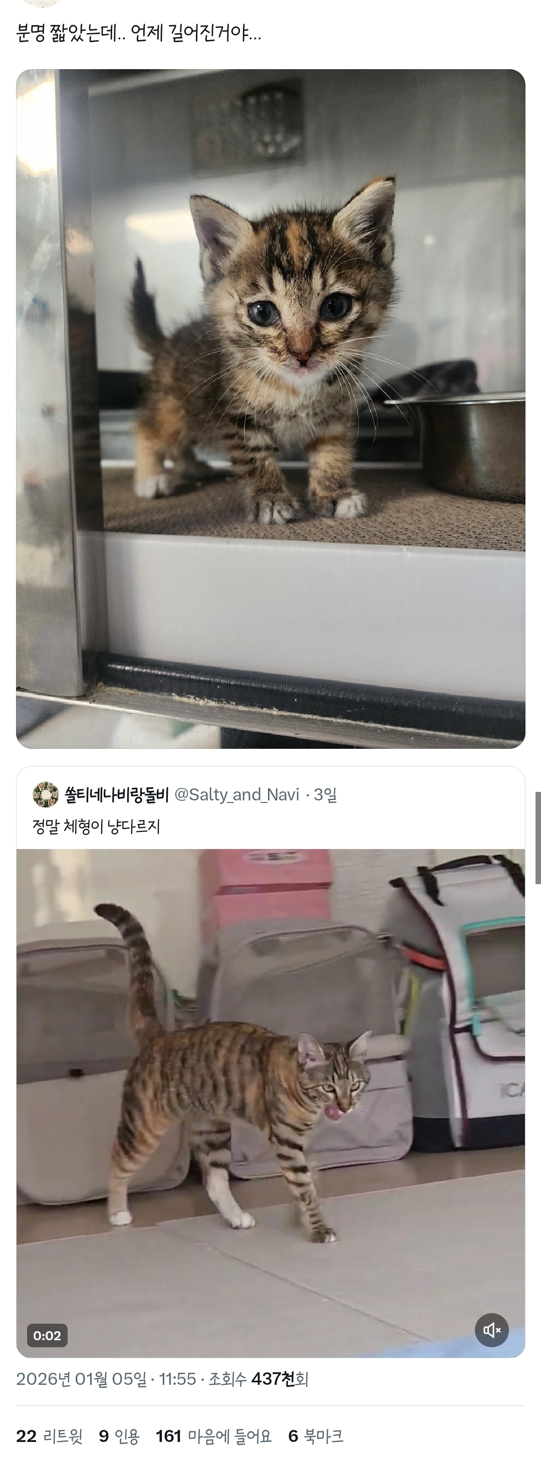 [힐링]분명 짧았는데.. 언제 길어진거야... 작성자카이지|작성시간26.01.07|조회수21,146 목록 댓글 29 글자크기 작게가 글자크기 크게가 출처: https://twitter.com/Salty_and_Navi/status/2007683389546213780?t=JMXmuPjAKJ7frOumL-4Mfw&s=19(클릭 시 이동)https://twitter.com/_JAEDA__/status/2008009342264676707?t=ES8T1gRpOK83xoWs4B5HYQ&s=19https://twitter.com/Salty_and_Navi/status/2008013549365575723?t=ES8T1gRpOK83xoWs4B5HYQ&s=19 다음검색 현재 게시글 추가 기능 열기 북마크 공유하기 신고 센터로 신고 댓글 댓글 29 댓글쓰기 답글쓰기 댓글 리스트 작성자아우와 | 작성시간 26.01.07 와 롱다리~~ 넘 우아하구이뻐 ㅠㅠ 작성자힐러 | 작성시간 26.01.07 와 너 모델해라 작성자추워야겨울이다 | 작성시간 26.01.07 와 모델냥이다 작성자VTIC 신청려 | 작성시간 26.01.07 모델이네 작성자참치마유주먿빕 | 작성시간 26.01.07 다리 진짜 길다ㅋㅋㅋㅋㅋㅋㅋㅋㅋ 댓글 전체보기