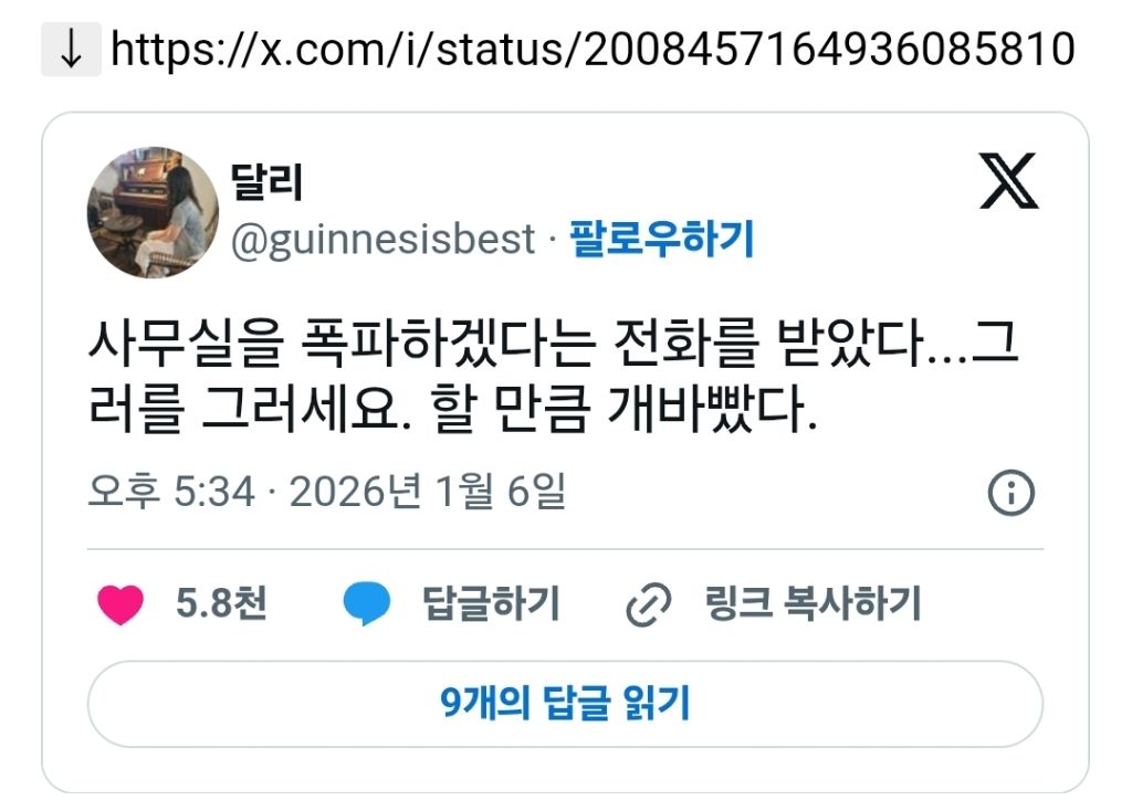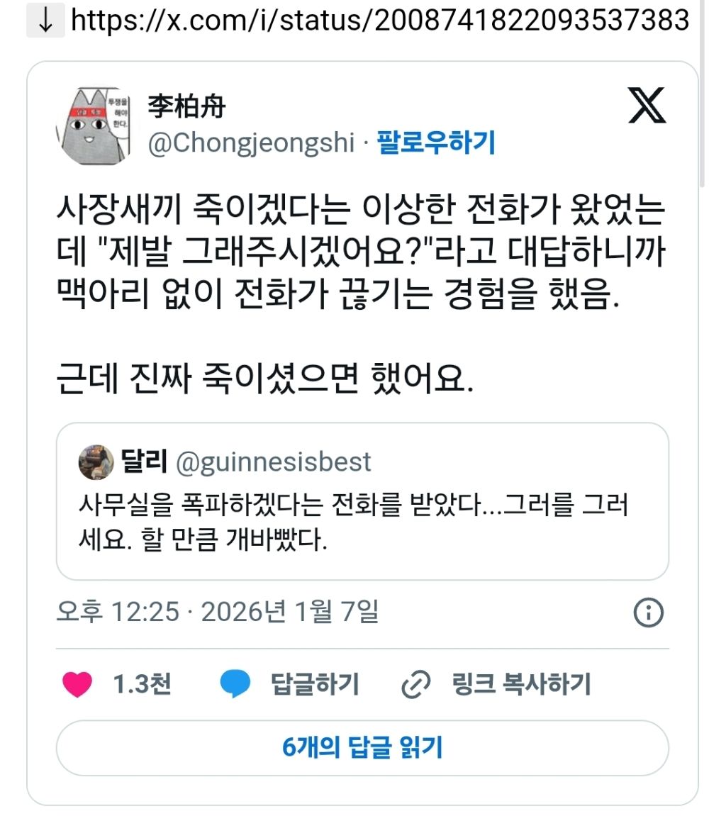 [스크랩] [흥미돋]사무실을 폭파하겠다는 전화를 받았다 작성자푸크린|작성시간26.01.07|조회수44,556 목록 댓글 47 글자크기 작게가 글자크기 크게가 소울드레서는 우리가 만들어가는 소중한 공간입니다.댓글 작성 시 타인에 대한 배려와 책임을 다해주세요.제발요 다음검색 스크랩 원문 : 비공개카페 현재 게시글 추가 기능 열기 북마크 공유하기 신고 센터로 신고 댓글 댓글 47 댓글쓰기 답글쓰기 댓글 리스트 작성자붕어빵드실래유 | 작성시간 26.01.07 와 드디어ㅠ 작성자얍얍휴 | 작성시간 26.01.07 빡대갈인가... 저게 협박이될거라생각했나...ㅋㅋㅋㅋ 작성자우아아앙아 | 작성시간 26.01.07 전화라도 주세요 희망이라도 가지게... 작성자이리일디 | 작성시간 26.01.08 와 정말요? 작성자쟝포니 | 작성시간 26.01.08 니 직장 생활 안 해봤지 댓글 전체보기