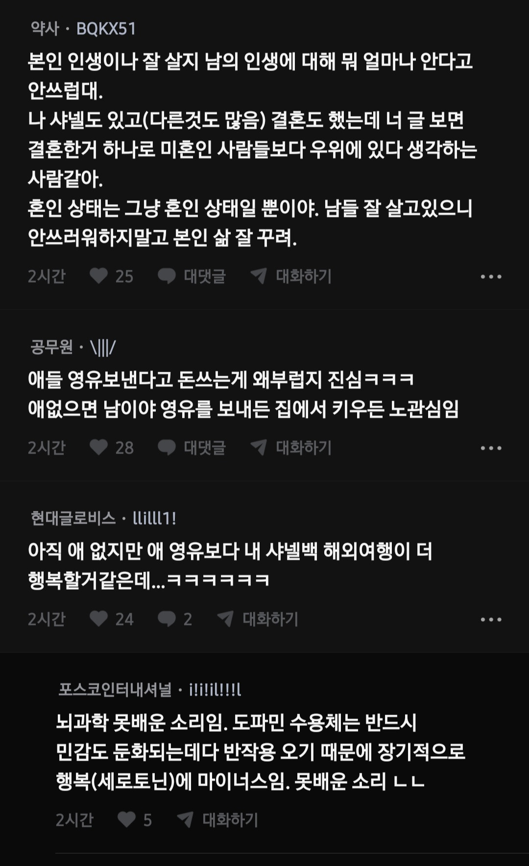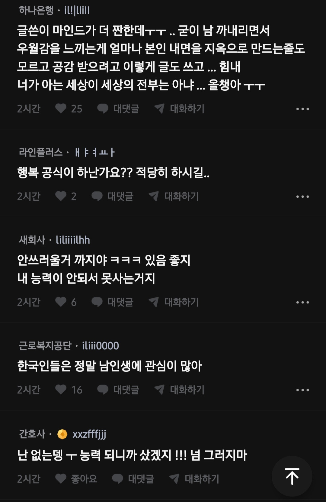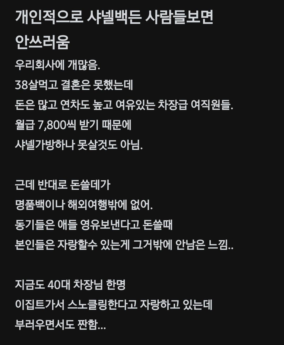[스크랩] [흥미돋]개인적으로 샤넬백 든 나이든 미비혼보면 안쓰러움.blind 작성자백비|작성시간26.01.07|조회수34,958 목록 댓글 198 글자크기 작게가 글자크기 크게가 출처: https://www.dmitory.com/issue/390277254이슈/유머 - 개인적으로 샤넬백 든 나이든 미비혼보면 안쓰러움.blind익명 정보 커뮤니티 사이트www.dmitory.com 다음검색 스크랩 원문 : *여성시대* 차분한 20대들의 알흠다운 공간 현재 게시글 추가 기능 열기 북마크 공유하기 신고 센터로 신고 댓글 댓글 198 댓글쓰기 답글쓰기 댓글 리스트 작성자LI LI | 작성시간 26.01.08 개부럽다 작성자가랏 식인친칠라 | 작성시간 26.01.08 정신승리 작성자낼롱낼롱 | 작성시간 26.01.08 개부럽다 …. 작성자비쵸비라테 | 작성시간 26.01.08 부러운데 작성자윤썩열뒤져라 | 작성시간 26.01.08 ㅋㅋㅋㅋ 부럽다 해라 붕신아 댓글 전체보기