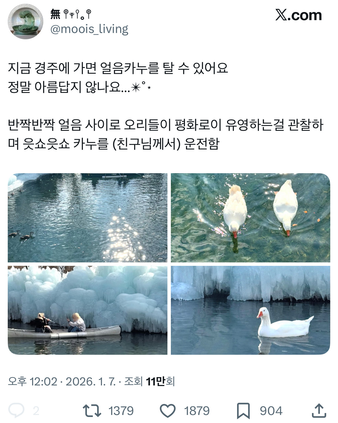 [흥미돋]지금 경주에 가면 얼음카누를 탈 수 있어요.x 작성자자경이친구|작성시간26.01.07|조회수44,388 목록 댓글 31 글자크기 작게가 글자크기 크게가 출처: https://x.com/moois_living/status/2008736052241170504 다음검색 현재 게시글 추가 기능 열기 북마크 공유하기 신고 센터로 신고 댓글 댓글 31 댓글쓰기 답글쓰기 댓글 리스트 작성자주게더 | 작성시간 26.01.08 저게 바로 언덕인가요ㅋ 답댓글 작성자gabojago | 작성시간 26.01.08 답댓글 작성자아응애예요엉엉 | 작성시간 26.01.08 우와 작성자Valancy Stirling | 작성시간 26.01.12 와 신비롭다 ㅋㅋㅋ 작성자이수현 | 작성시간 26.02.17 와 예쁘다 댓글 전체보기