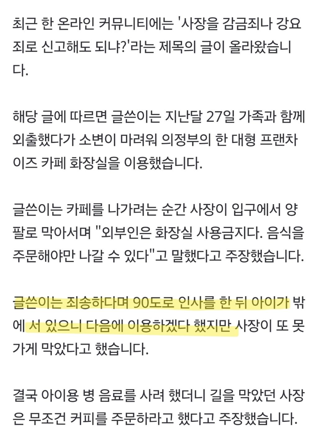전에 여시쩌리에도 올라왔던 이 사건ㅎㅎㅎ 어떤 부부가 아이랑 같이 카페에 와서 화장실을 이용하려고 했는데 90도로 인사하고 키즈음료 주문한다고 했음에도 불구하고 사장이 이용을 못하게 했다면서 사장을 감금죄로 처벌 가능하냐고 커뮤에 올라왔던 글 (부부 중 남편이 올림)