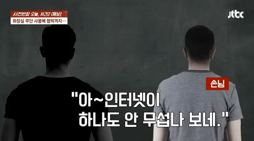 화장실 슬쩍 쓰고나서 도망가려다가 사장이 음료 주문해야한다고 하자 실랑이 끝에 3200원짜리 아메리카노 하나 주문함. 그 이후 부부의 태도가 문젠데...