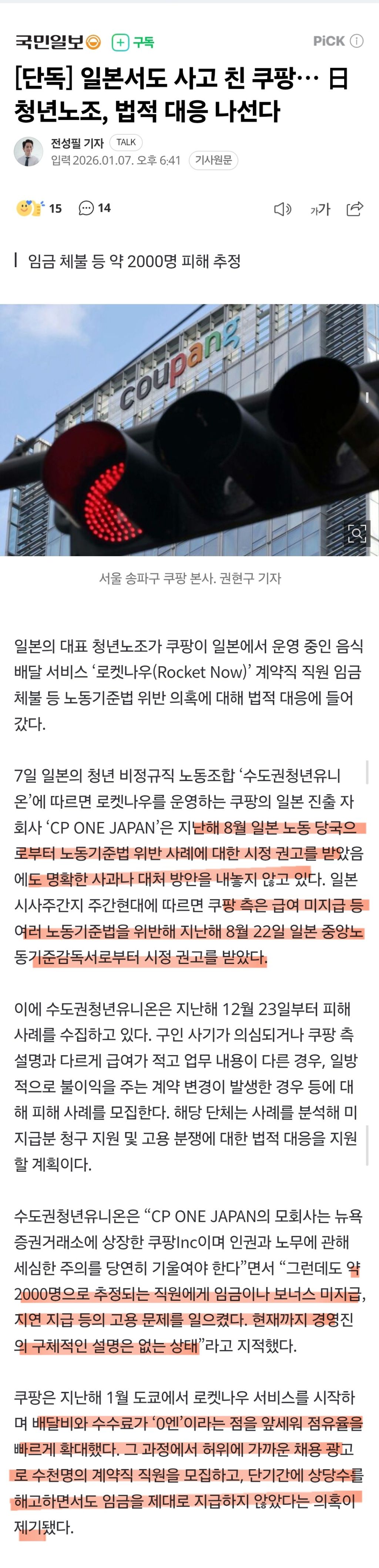 [스크랩] [여시뉴스데스크][단독] 일본서도 사고 친 쿠팡… 日 청년노조, 법적 대응 나선다 작성자정동남|작성시간26.01.07|조회수2,809 목록 댓글 4 글자크기 작게가 글자크기 크게가 https://n.news.naver.com/mnews/article/005/0001824772?sid=104[단독] 일본서도 사고 친 쿠팡… 日 청년노조, 법적 대응 나선다일본의 대표 청년노조가 쿠팡이 일본에서 운영 중인 음식배달 서비스 ‘로켓나우(Rocket Now)’ 계약직 직원 임금체불 등 노동기준법 위반 의혹에 대해 법적 대응에 들어갔다. 7일 일본의 청년 비n.news.naver.com 다음검색 스크랩 원문 : 이종격투기 현재 게시글 추가 기능 열기 북마크 공유하기 신고 센터로 신고 댓글 댓글 4 댓글쓰기 답글쓰기 댓글 리스트 작성자윈디웬디 | 작성시간 26.01.07 왜케 싸가지없이 경영하지 뭘믿고 여기저기.. 작성자표준지침 | 작성시간 26.01.07 이런데도 쿠팡을 돕자느니ㅋㅋㅋ기가차서 말ㅇㅣ 안나옴 작성자쟈스민레몬밤 | 작성시간 26.01.07 대만에서도 일본에서도 대다나다 증말 ㅋㅋ 작성자포카리해 | 작성시간 26.01.08 정말....절레절레 댓글 전체보기