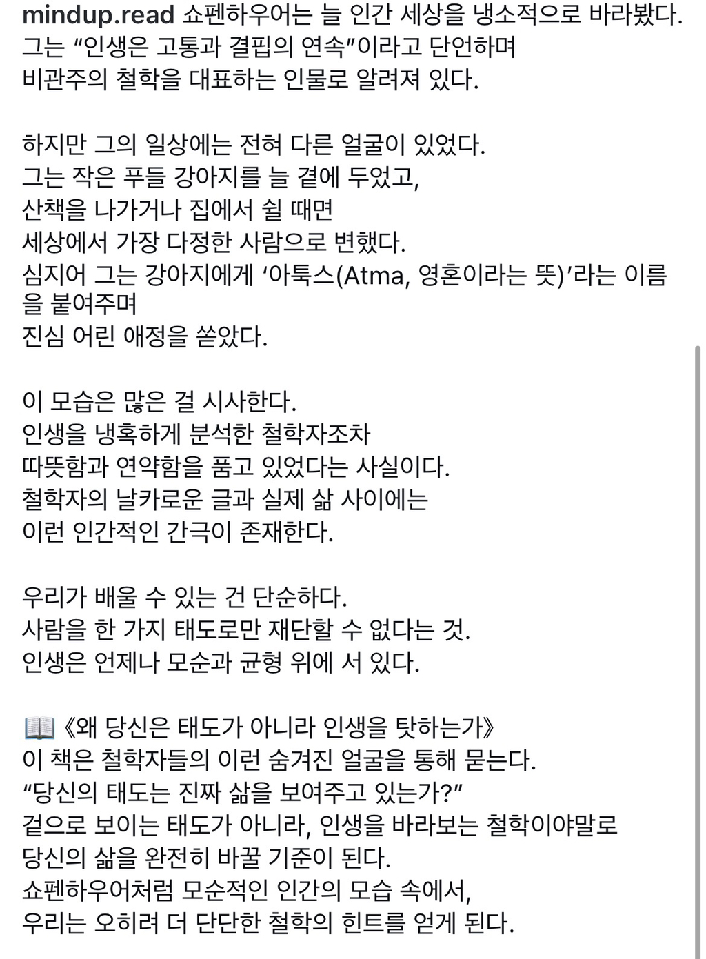 [흥미돋]비관주의자 쇼펜하우어 강아지 앞에서는 가장 다정했다. 작성자Marshall|작성시간26.01.07|조회수9,313 목록 댓글 11 글자크기 작게가 글자크기 크게가 출처: 여성시대 (Marshall)인스타그램 mindup.read 다음검색 현재 게시글 추가 기능 열기 북마크 공유하기 신고 센터로 신고 댓글 댓글 11 댓글쓰기 답글쓰기 댓글 리스트 답댓글 작성자Krafwerk | 작성시간 26.01.08 나도….ㅠ 작성자에이스스스 | 작성시간 26.01.08 아무래도 인간은 극혐이고 동물은 사랑이니까 작성자INNOUTBB | 작성시간 26.01.08 강아지는 귀여워 작성자리버스페스 | 작성시간 26.01.08 강아지는 귀엽고 인간은 강아지만큼은 안귀여우니까 작성자무화과깜빠뉴 | 작성시간 26.01.08 강쥐헴 할배의 세상을 구했구나 댓글 전체보기