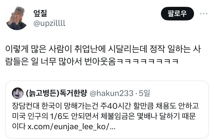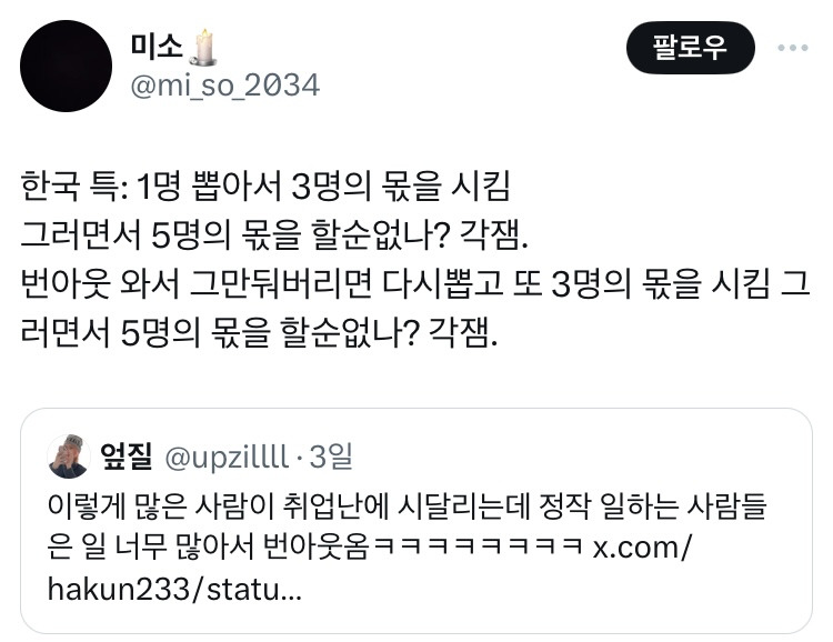 [스크랩] [흥미돋]취업난 때문에 힘들어하는데 정작 취업하면 번아웃 옴 작성자째롱이|작성시간26.01.08|조회수13,911 목록 댓글 39 글자크기 작게가 글자크기 크게가 출처: 여성시대 Rich진짜한명한테 1인분이 아닌3인분 일을 시켜그래서 야근이 잦은거임한국은근무시간도 길고 업무강도도 높고여자는 남자보다 임금 적게 받음신입한텐 최저주고싶어하고경력직한텐 신입 월급 주고싶어하고어떻게든 돈 깎아서 주고싶어함그러면서나이, 공백기, 경력, 외모 등등따지는 건 오지게 많음 다음검색 스크랩 원문 : *여성시대* 차분한 20대들의 알흠다운 공간 현재 게시글 추가 기능 열기 북마크 공유하기 신고 센터로 신고 댓글 댓글 39 댓글쓰기 답글쓰기 댓글 리스트 작성자진돗개 백설 | 작성시간 26.01.08 맞어맞어.. 취준이면 불안정병오고 회사다니면 공황같은거옴 ㅠ하ㅜ 작성자포카리해 | 작성시간 26.01.08 ㅇㄱㄹㅇ 진짜 한국 근무 여러가지 문제점이 많지...이것 좀 고쳐줬으면 작성자두두두다다닥 | 작성시간 26.01.08 ㅇㅈ 작성자장규리 여친 | 작성시간 26.01.08 야근 안하면 일 안많다고 생각하는게 빡침 작성자inFj | 작성시간 26.01.17 와 완전 공감,, 어쩌다 이렇게 됐을까 댓글 전체보기