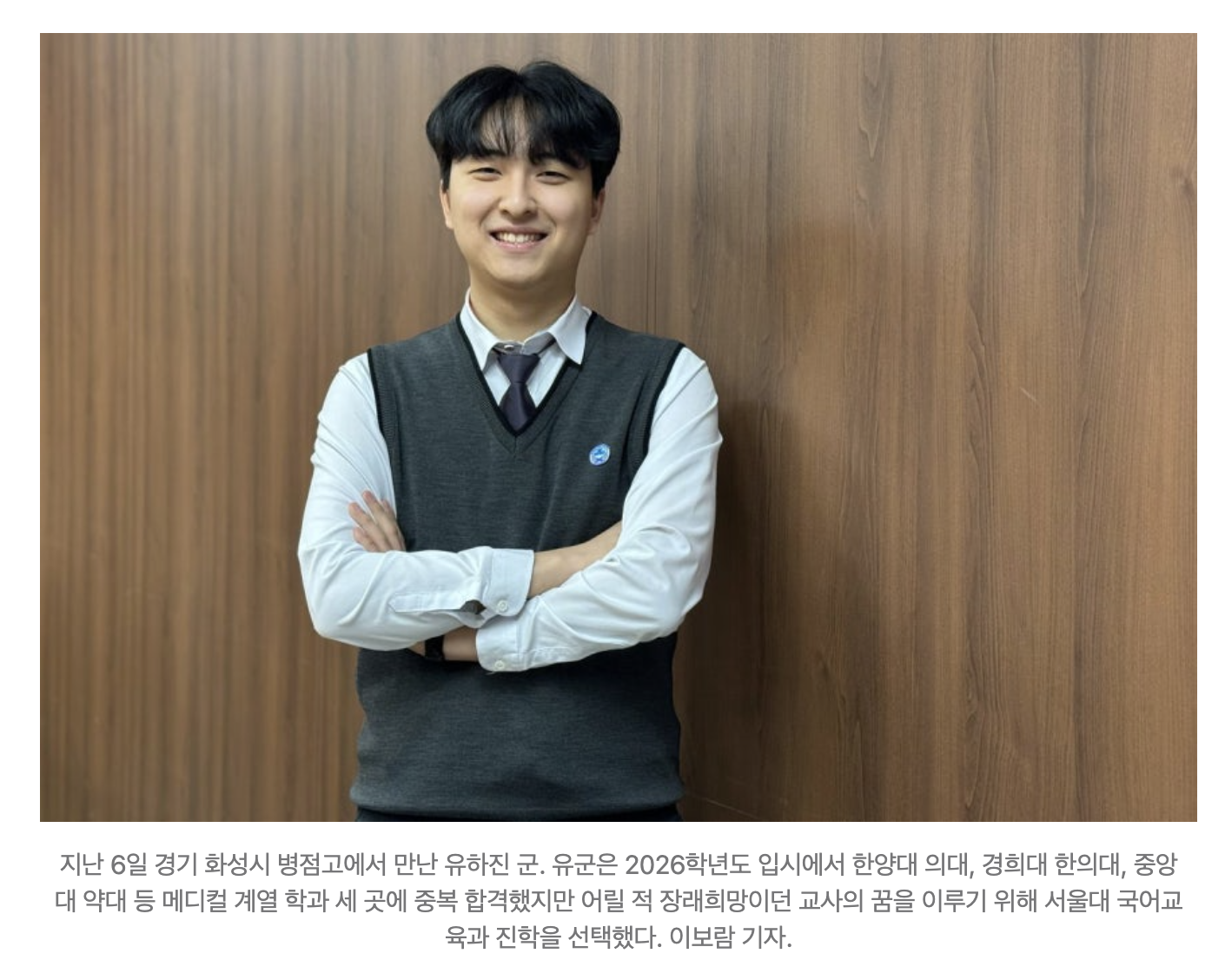 경기도 화성시 병점고(일반고) 3학년 유하진(19)군의 이야기다. 그는 2026학년도 대입 수시전형에서 한양대 의대, 경희대 한의대, 중앙대 약대, 서울대 국어교육과에 중복 합격했다. 남들의 예상과 달리 그는 서울대 국어교육과에 진학하기로 결정했다.