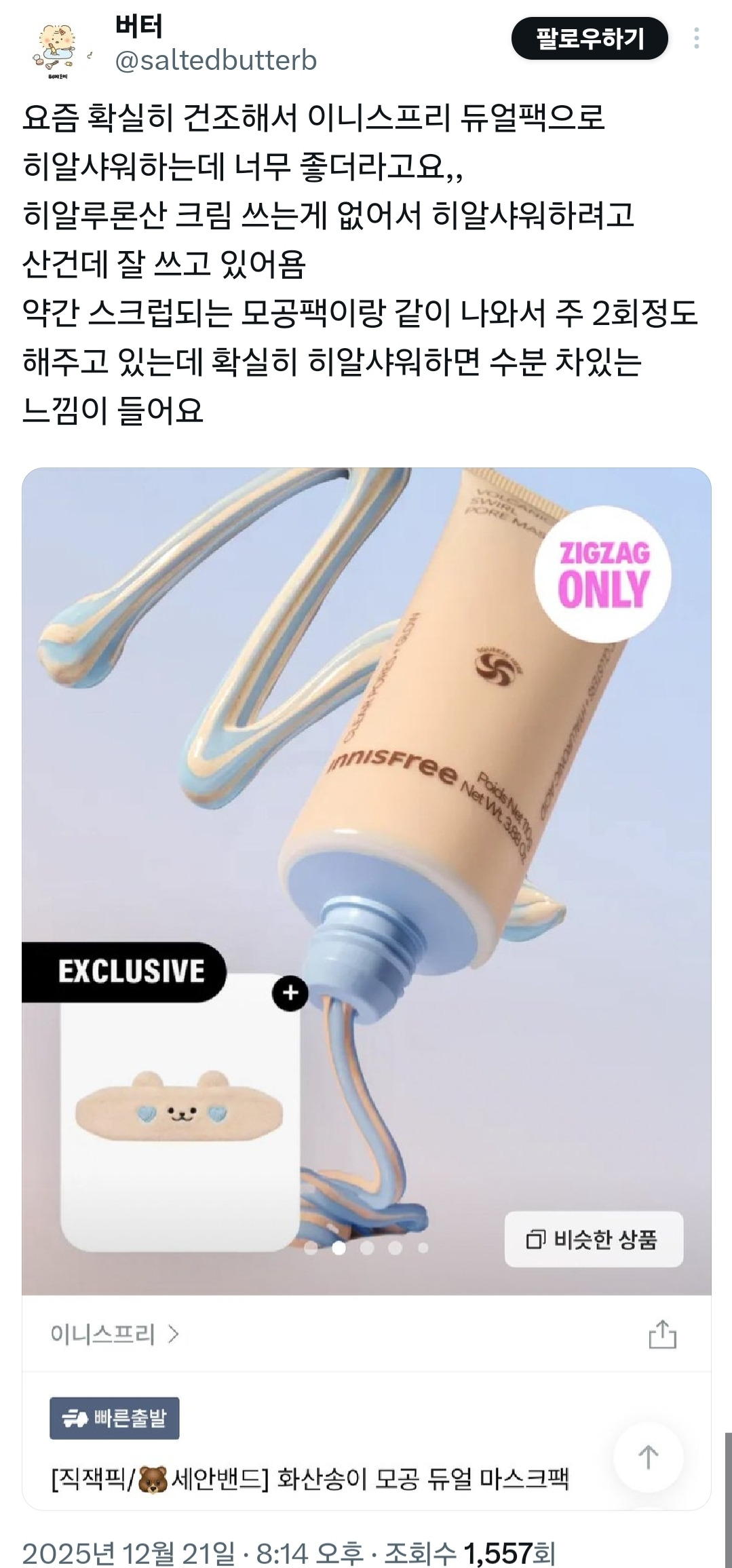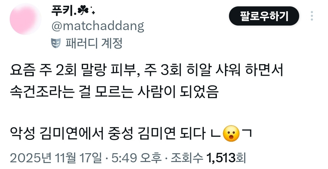 작성자eaJPARK 작성시간 26.01.25 ㅇ거 진짜 조아;;;; 이거 하고 화장하면 졸라다른거 확티나 그냥 맨얼굴도 쫀쫀함