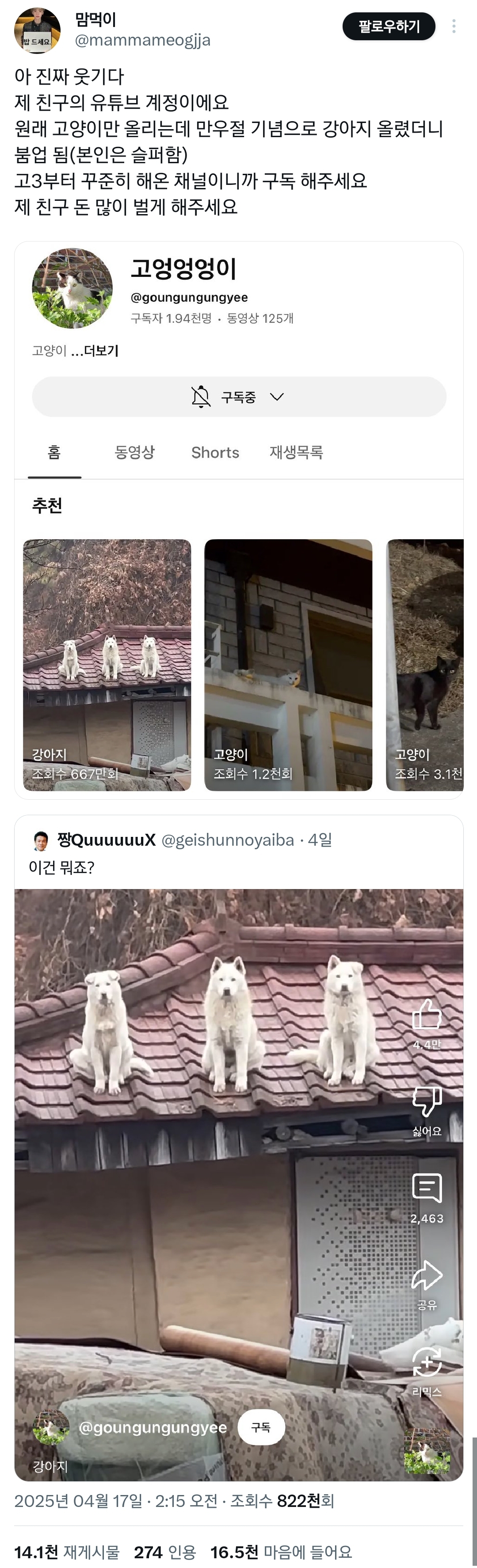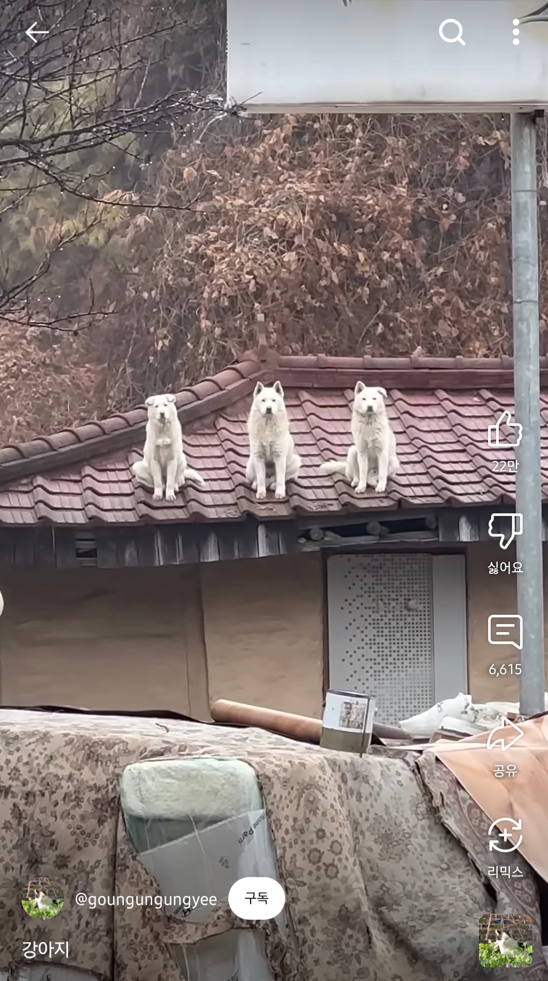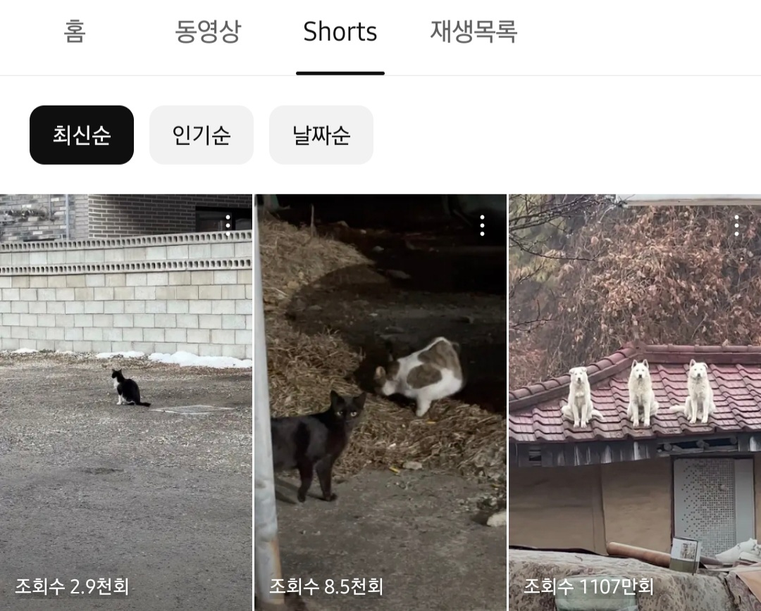 지붕 위 강아지 세마리 영상만 조회수 1107만회 ㅅㅂ