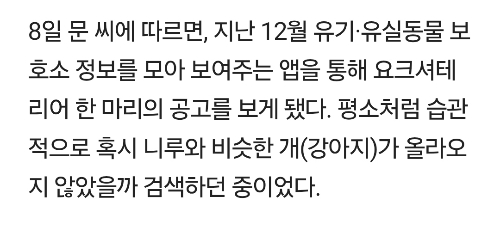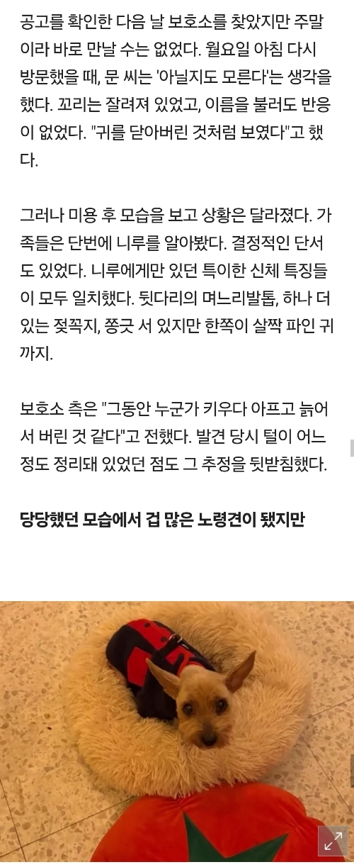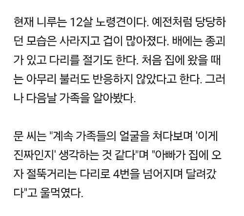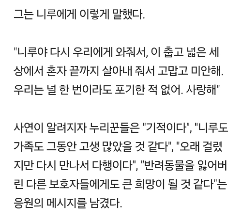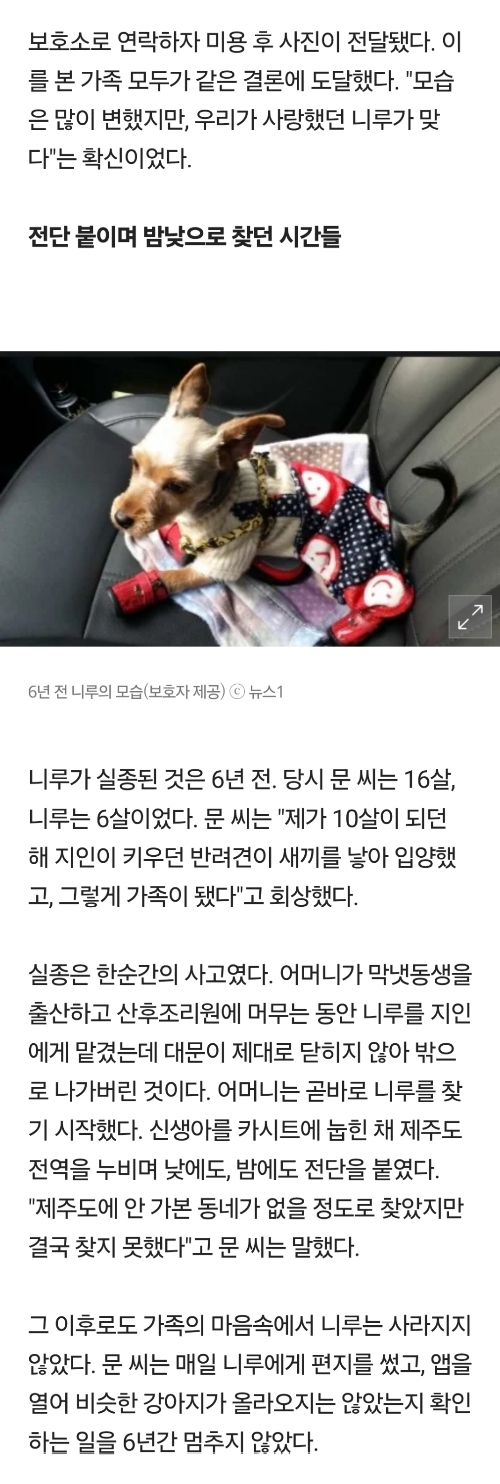 [여시뉴스데스크]"이미 죽은 줄 알았어요"…6년 전 잃어버린 반려견이 돌아왔다 작성자부탁할게|작성시간26.01.08|조회수25,058 목록 댓글 73 글자크기 작게가 글자크기 크게가 출처: 여성시대 (부탁할게)https://m.news.nate.com/view/20260108n05023 다음검색 현재 게시글 추가 기능 열기 북마크 공유하기 신고 센터로 신고 댓글 댓글 73 댓글쓰기 답글쓰기 댓글 리스트 작성자소다 | 작성시간 26.01.08 너무 부럽고 또 부럽다.. 니루야 이제 행복만해 작성자헤이댓츠미 | 작성시간 26.01.08 눈물난다 ㅠㅠㅠ니루야 행복해 작성자노만 리더스 | 작성시간 26.01.08 이제 행복하기만 하길 작성자이게뭐람람 | 작성시간 26.01.08 니루야 가족들과 행복하자 작성자레츠꼬 | 작성시간 26.01.08 하 진짜ㅠㅠㅠㅠㅠㅠ 댓글 전체보기