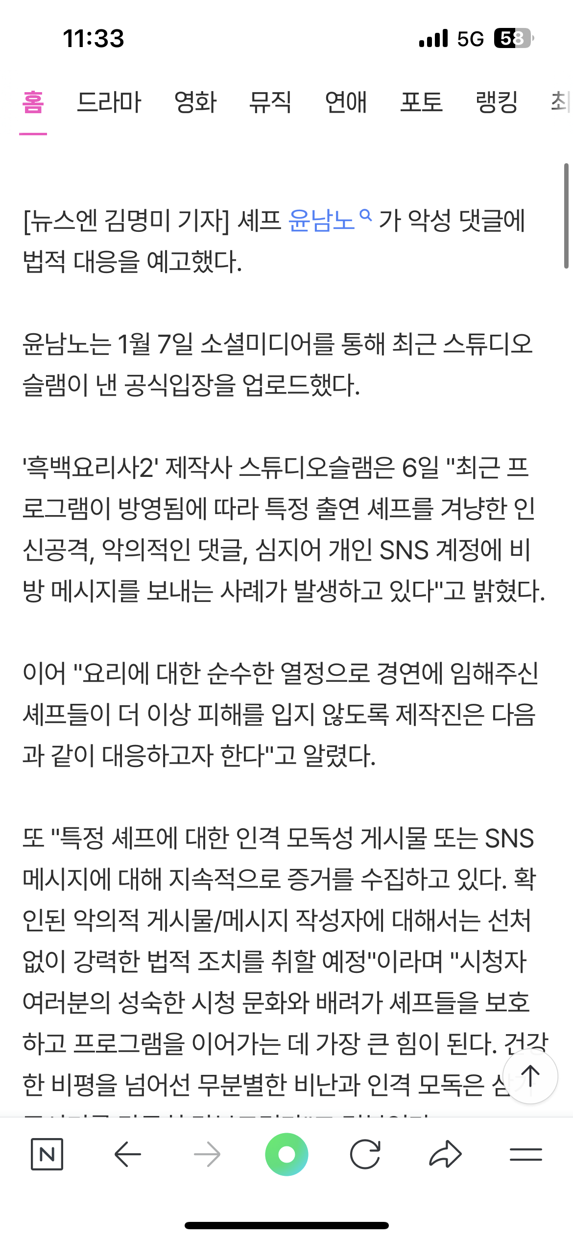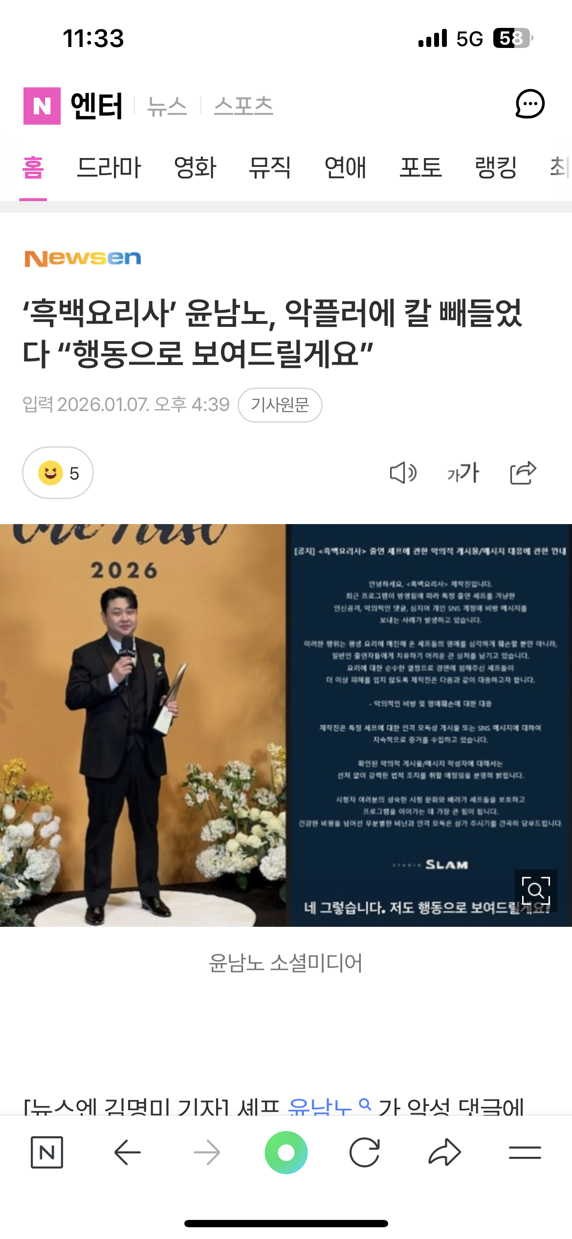 [여시뉴스데스크]‘흑백요리사’ 윤남노, 악플러에 칼 빼들었다 “행동으로 보여드릴게요” 작성자r=vd평화로운26년|작성시간26.01.08|조회수30,786 목록 댓글 21 글자크기 작게가 글자크기 크게가 출처: https://m.entertain.naver.com/home/article/609/0001078198‘흑백요리사’ 윤남노, 악플러에 칼 빼들었다 “행동으로 보여드릴게요”여기를 눌러 링크를 확인하세요m.entertain.naver.com👇아마 이거때문인듯? 다음검색 현재 게시글 추가 기능 열기 북마크 공유하기 신고 센터로 신고 댓글 댓글 21 댓글쓰기 답글쓰기 댓글 리스트 작성자Qterw_ㅁ_612 | 작성시간 26.01.08 남노야 넝담은 괜찮지...?우리 인프피잔아.. 답댓글 작성자룰루랄라주말 | 작성시간 26.01.08 윤남노 인프피야..? 답댓글 작성자Qterw_ㅁ_612 | 작성시간 26.01.08 룰루랄라주말 엣프피라는데 아닌거같음 작성자숑숑깔깔 | 작성시간 26.01.08 굿 남노 응원함 작성자난무민이좋아 | 작성시간 26.01.08 와 무슨 식당에도 플미충이 붙네 징글징글하다 댓글 전체보기