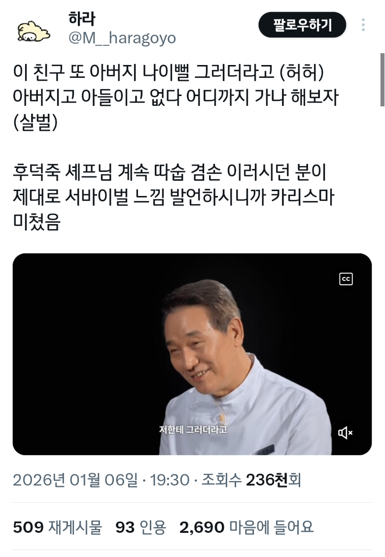 [흥미돋](흑백요리사) 독기와 욕심이 가득한 자 vs 경지에 오른 자 (스포) 작성자보닌|작성시간26.01.08|조회수39,499 목록 댓글 168 글자크기 작게가 글자크기 크게가 출처: 여성시대 보닌https://x.com/i/status/2008486235531256295(영상으로 보기)무한 당근 지옥 요리괴물 vs 후덕죽 1:1 결승전에서 요괴 투표 실수 -30 다음검색 현재 게시글 추가 기능 열기 북마크 공유하기 신고 센터로 신고 댓글 댓글 168 댓글쓰기 답글쓰기 댓글 리스트 작성자젬민이 | 작성시간 26.01.11 요괴투표실수햇어요 ㅠ ㅜ 작성자넝담곰 | 작성시간 26.01.11 아 실수합 ㅅㅂ ㅜㅜㅋㅋㅋㅋㅋㅋㅋㅋㅋㄱ이런거 왜 실수하나 했는데ㅋㅋㅋㅋㅋㅋ내가 실수를... 작성자짝째 | 작성시간 26.01.11 아씨 나도 실수함 작성자먹밥쿵야 | 작성시간 26.01.12 덕죽이 ㅋㅋㅋㅋㅌ 작성자전지현 | 작성시간 26.01.14 휴 실수할 뻔 했다 댓글 전체보기