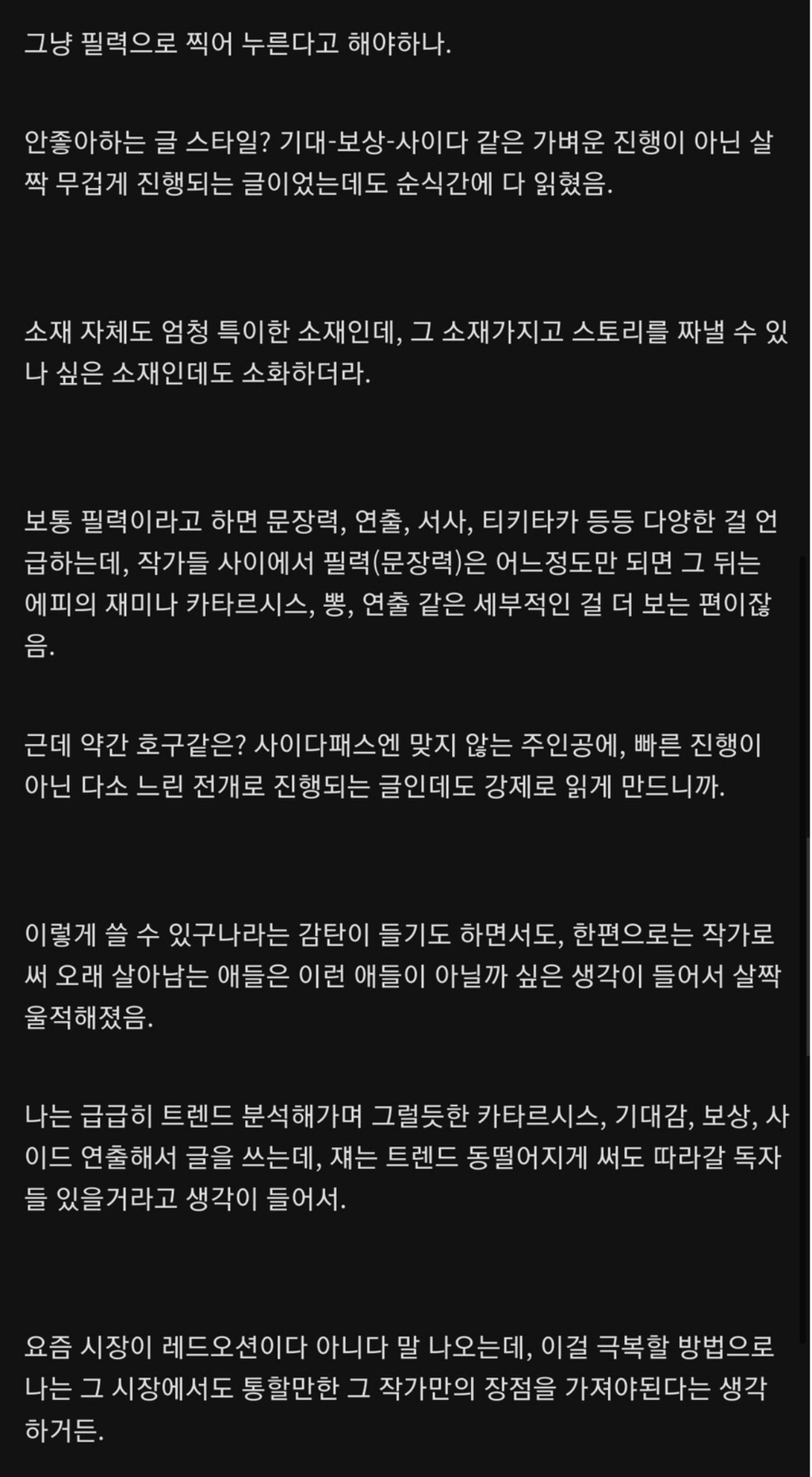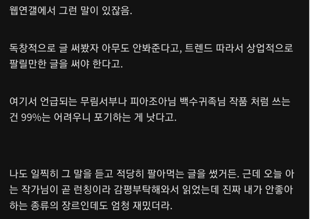 작성자하파데이 작성시간 26.01.08 어바등 보면서 초반에 비문 너무 많아서 외국인작가가 번역기쓴건가? 싶을때가 있기도 했지만 그 현장감이랑 인물묘사, 주인공의 독백을 그정도로 재밌게 써서 사람들을 몰입하게 하는건 필력 맞다고 생각. 근데 요새 사이다패스가 주여서 호구같은 이타적인 캐릭터가 박무현 외엔 딱히 기억나진 않네. 차재림정도..? 웹소설은 초반 흡입력+완결까지 무너지지 않는 세계관+한편도 지루하게 느껴지면 안되는 재미까지 있어야해서 쉽지않은듯