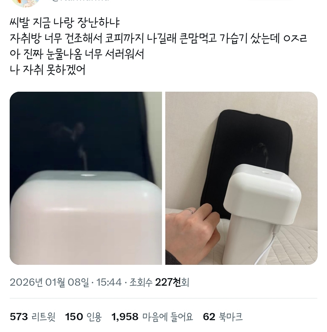 [배꼽의행방]자취방이 너무 건조해서 가습기를 샀다.twt 작성자카이지|작성시간26.01.08|조회수21,989 목록 댓글 26 글자크기 작게가 글자크기 크게가 출처: https://twitter.com/rlarmdrmd/status/2009154106745860479?t=cXg3wDdaq3GlKCredP_ixw&s=19https://twitter.com/rlarmdrmd/status/2009154106745860479?t=s_uOEK-EkY-3YWpyj3edPQ&s=19(클릭 시 이동)하 시바 개어이없어 다음검색 현재 게시글 추가 기능 열기 북마크 공유하기 신고 센터로 신고 댓글 댓글 26 댓글쓰기 답글쓰기 댓글 리스트 작성자zoodasa | 작성시간 26.01.08 아앀ㅋㅋㅋㅋ최근에 저거똑같은거 삿는데 잘나오던데ㅠㅋㅋㅋ불량이거나 필터 안적셧나봐 작성자이보쇼 | 작성시간 26.01.08 필터를 안적신듯… 미숙지면 판매자만 피해볼텐딩 작성자인생쉽지않구만 | 작성시간 26.01.08 필터 젖으면 괜찮아짐ㅋㅋ 작성자무한상사유부장 | 작성시간 26.01.08 아 ㅅㅂㅋㅋㅋㅋㅋㅋㅋㅋㅋㅋ 작성자이리일디 | 작성시간 26.01.08 뭔 모기향도 아니고 ㅋㅋㅋ 댓글 전체보기