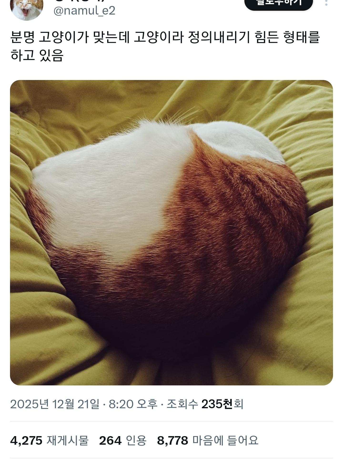 [흥미돋]분명 고양이가 맞는데 고양이라 정의내리기 힘든 형태를 하고 있음 작성자너너뉘기야|작성시간26.01.08|조회수27,976 목록 댓글 7 글자크기 작게가 글자크기 크게가 출처: https://x.com/i/status/2002700674132509057ㄱㅇㅇㅋㅋㅋㅋㅋ네모다 다음검색 현재 게시글 추가 기능 열기 북마크 공유하기 신고 센터로 신고 댓글 댓글 7 댓글쓰기 답글쓰기 댓글 리스트 작성자고먐미빵뎅이 | 작성시간 26.01.08 크림빵 작성자소울BLUE | 작성시간 26.01.08 두쫀쿠 이미지 확대 작성자오늘의할일 | 작성시간 26.01.08 송편망개떡 작성자벌레다죽어라 | 작성시간 26.01.08 하 그대로 퍼서 담아서 들고 튀고싶다 작성자초한지 | 작성시간 26.01.08 망개떡이잖아 댓글 전체보기