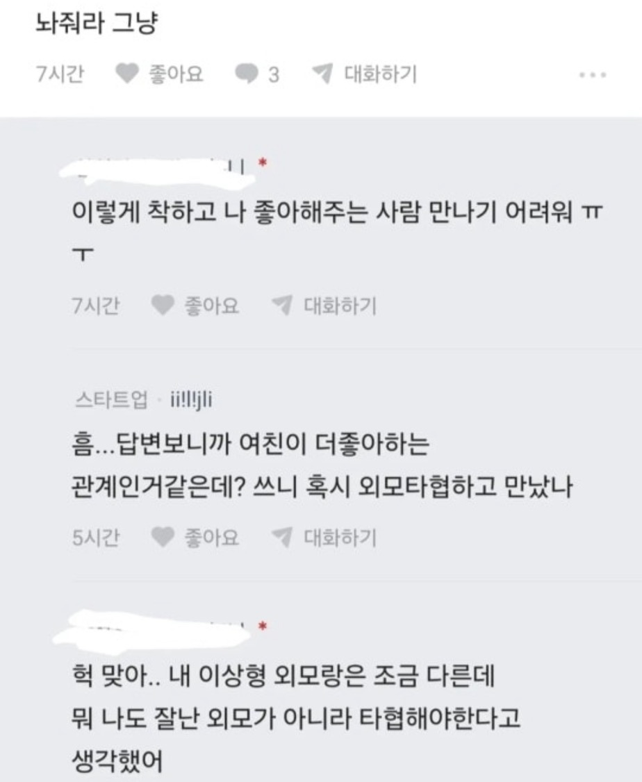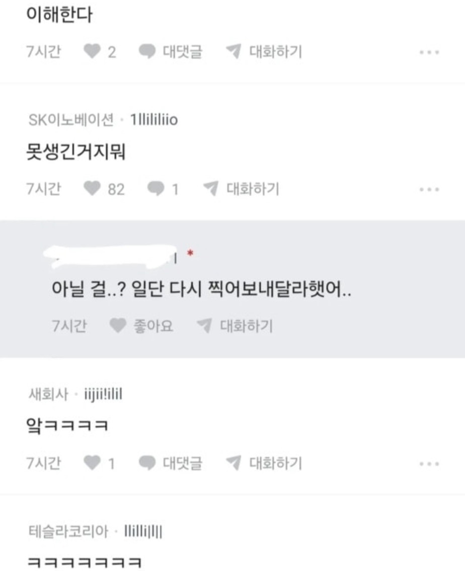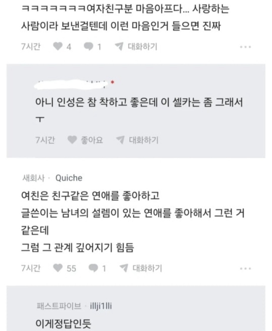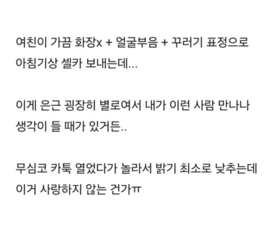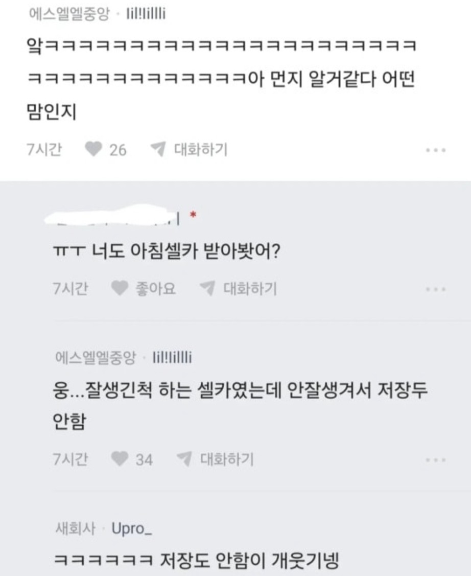 [흥미돋]아침셀카에 좀 정떨어지면… 안사랑하는건가? 작성자니나니노니고질라야|작성시간26.01.08|조회수61,215 목록 댓글 76 글자크기 작게가 글자크기 크게가 출처: 여성시대 니나니노니고질라야 다음검색 현재 게시글 추가 기능 열기 북마크 공유하기 신고 센터로 신고 댓글 댓글 76 댓글쓰기 답글쓰기 댓글 리스트 작성자밍규스 | 작성시간 26.01.08 나도 싫을듯.... 누구 셀카든 걍 당황스러움 작성자수구수구링 | 작성시간 26.01.08 스타일 차이지 뭐 작성자세종그린 | 작성시간 26.01.08 난 걍 누구든 냅다 셀카 보내는 거 싫어함 작성자웜뱃의 네모네모똥 | 작성시간 26.01.08 근데 진짜 저 심리가 뭘까 왜 띡 보내는건데 대체.. 작성자크러쉬-SKIP | 작성시간 26.01.09 나도별로 댓글 전체보기