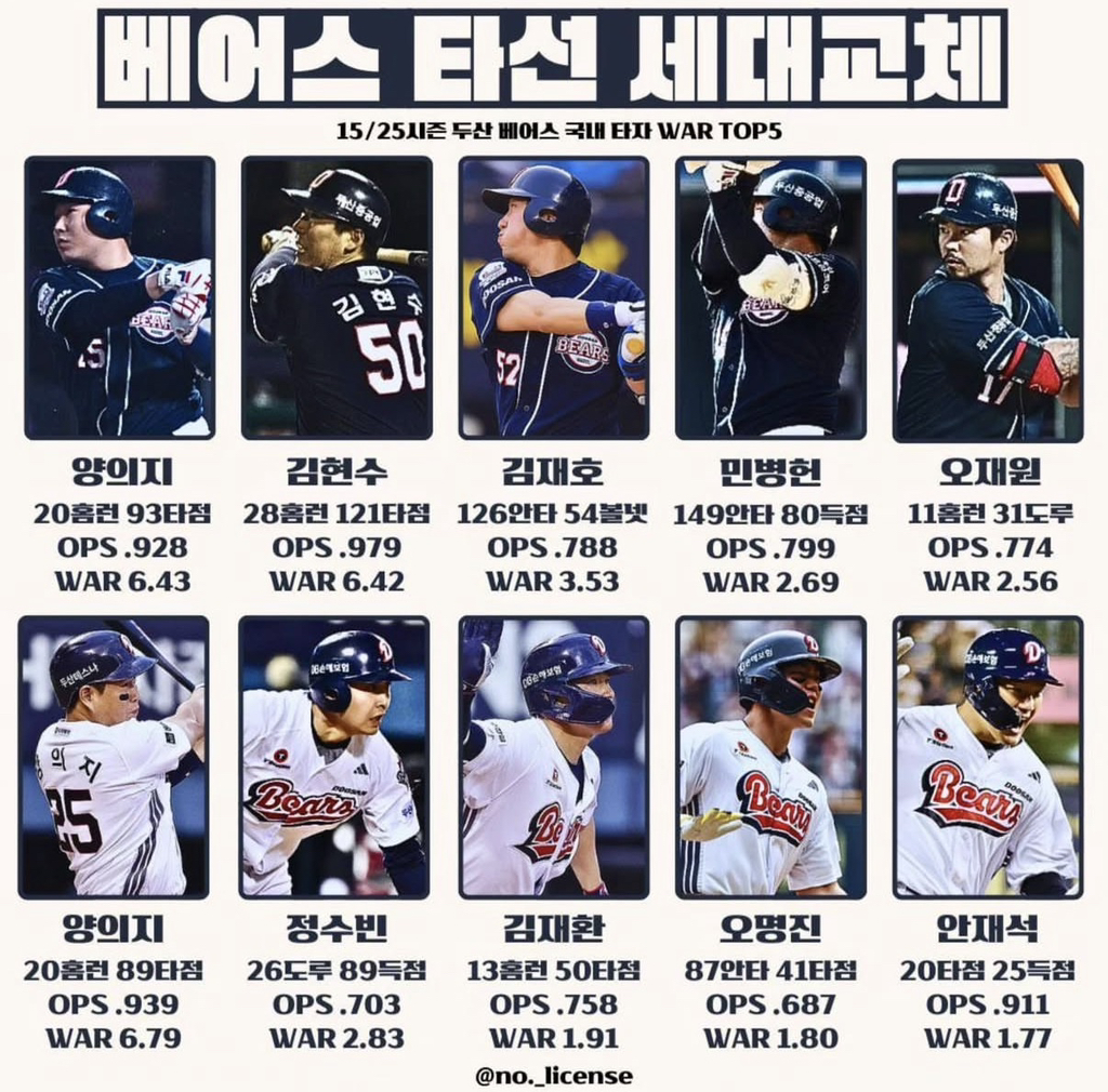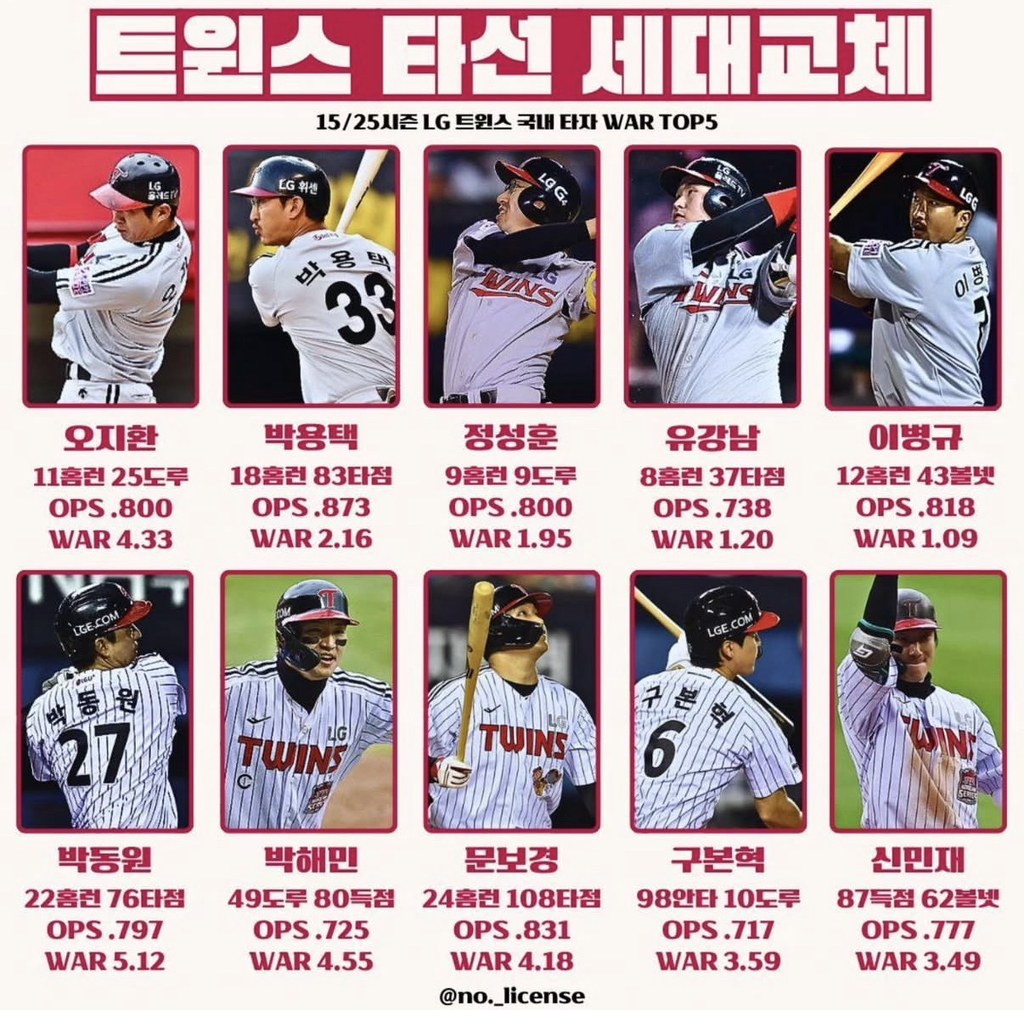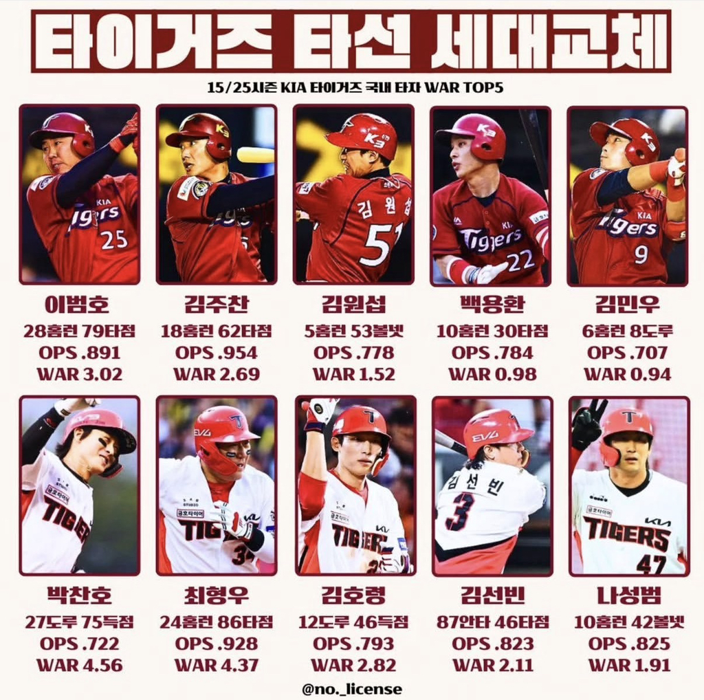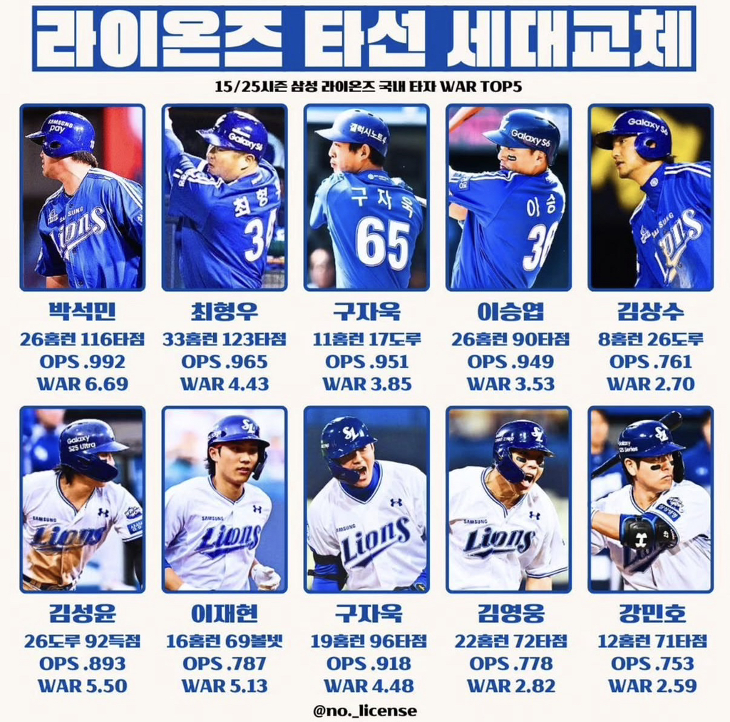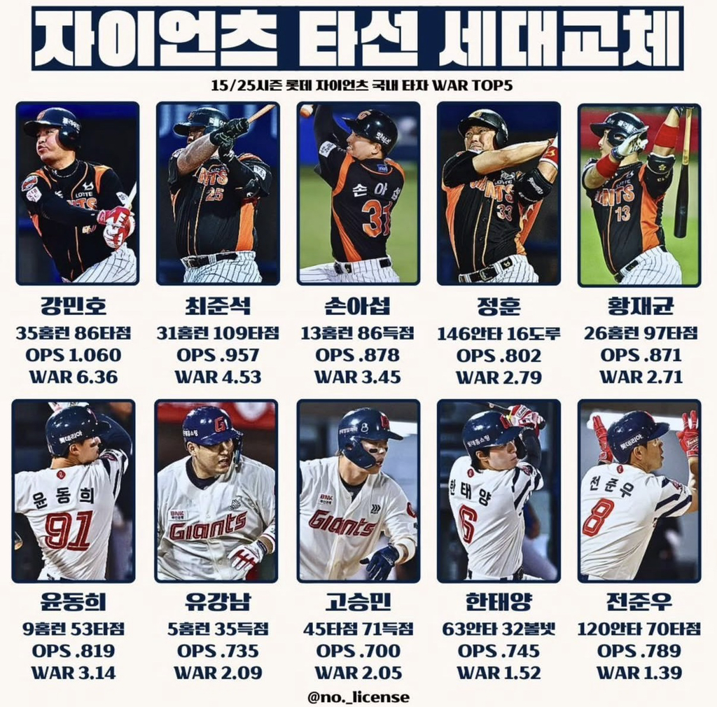 [흥미돋][야구] 각 팀별 타선 세대교체 (15vs25) 작성자죄송합니다겠냐고|작성시간26.01.08|조회수4,958 목록 댓글 30 글자크기 작게가 글자크기 크게가 출처: 여성시대 죄송합니다겠냐고2015 vs 2025 팀별 국내 타자 WAR TOP5 다음검색 현재 게시글 추가 기능 열기 북마크 공유하기 신고 센터로 신고 댓글 댓글 30 댓글쓰기 답글쓰기 댓글 리스트 작성자시들시들 허세감자 | 작성시간 26.01.08 최정랜더스 작성자롯데자이언츠기죽지마라죽어라 | 작성시간 26.01.08 세대교체 되면서 허벌타선 돼뿟노 작성자10000310 | 작성시간 26.01.08 자이언츠는 세대교체라 할수있나요? ㅎ 작성자THE NOIR 29 | 작성시간 26.01.09 낡지 마 양의지 제발 작성자ㄱㅅㄱㅅㄱㅅㄱㅅ | 작성시간 26.01.09 박민우 몸 관리 잘 해라 댓글 전체보기