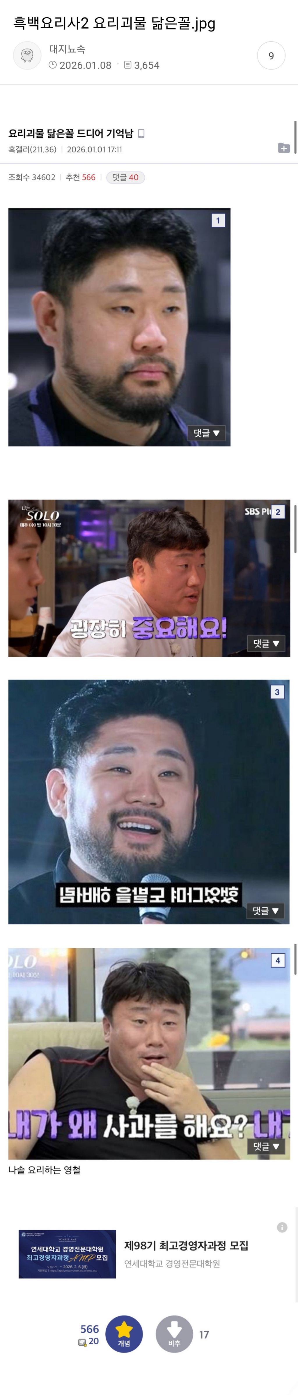 [기타]흑백요리사2 요리괴물 닮은꼴 드디어 기억남 작성자스냅랙|작성시간26.01.09|조회수31,928 목록 댓글 75 글자크기 작게가 글자크기 크게가 출처: https://m.dcinside.com/board/blackwhites2/152426 다음검색 현재 게시글 추가 기능 열기 북마크 공유하기 신고 센터로 신고 댓글 댓글 75 댓글쓰기 답글쓰기 댓글 리스트 작성자아니아니아니 | 작성시간 26.01.09 헐 수염기르고 나온거아님? 작성자얍얍휴 | 작성시간 26.01.09 댜에박 작성자조림핑핑 | 작성시간 26.01.09 와...... 존똑이야 작성자세우버거 | 작성시간 26.01.09 악 나도 저생각함ㅋㅋㅋㅋㅋㅋㅋ 작성자쨔장소스 | 작성시간 26.01.09 으악!!!!!!! 똑같아!!!!!!!! 댓글 전체보기